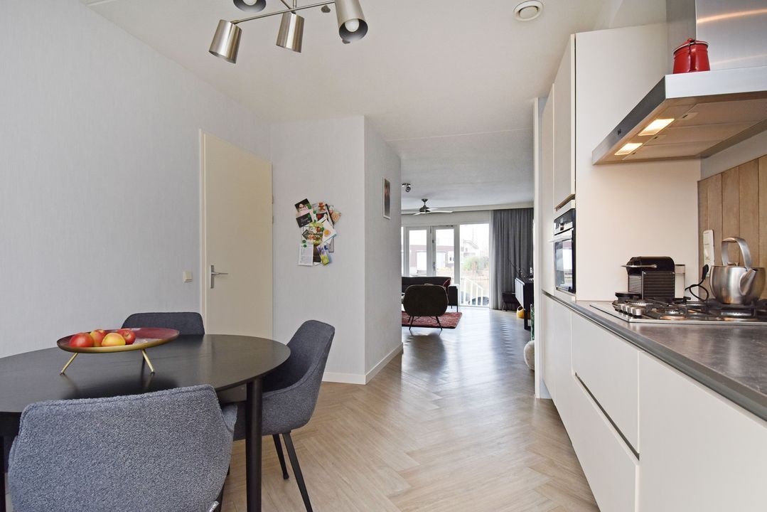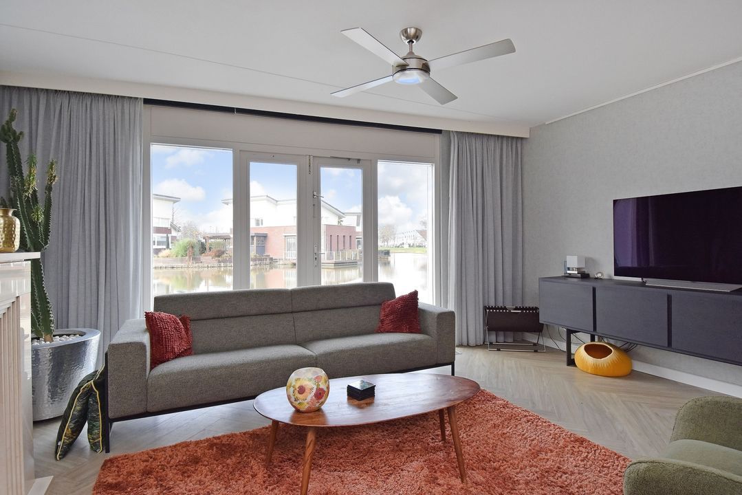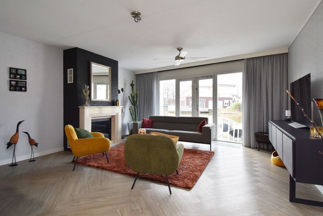 Ruime, circa 20 meter diepe voortuin met vrijstaande houten berging en eigen parkeerplaats. Entree/voorportaal met vide en meterkast. Hal met garderobe, trapkast en vaste trapopgang. Moderne, half betegelde toiletruimte met zwevend toilet met fonteintje. Aan de voorzijde ligt de moderne open keuken (2013) voorzien van fraaie visgraat pvc vloer en inbouwapparatuur, te weten: spoelbak, 4-pits gaskookplaat, RVS - afzuigschouw, vaatwasser, koelkast, vriezer, combi oven-/magnetron en twee openslaande deuren naar voortuin met aangebouwde overkapping. Lichte woonkamer voorzien van pvc vloer, open haard, convectorput en twee openslaande deuren naar riant houten steiger aan brede waterpartij.