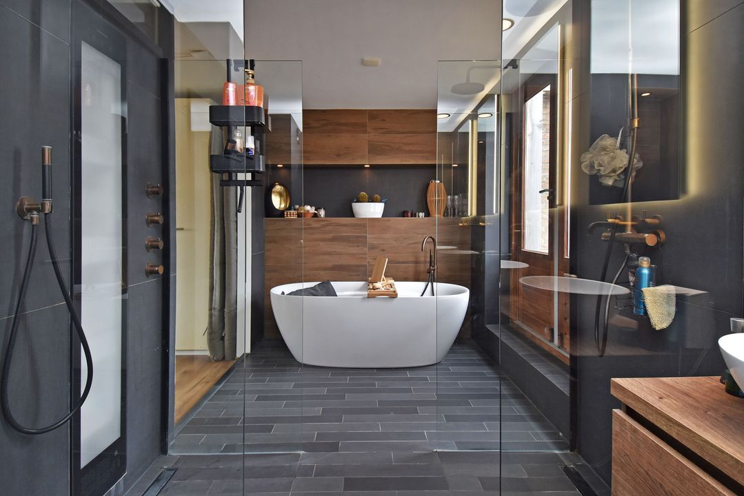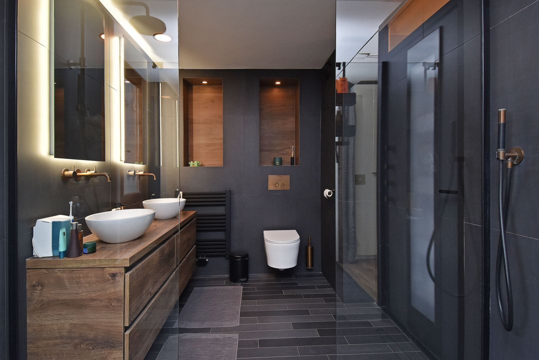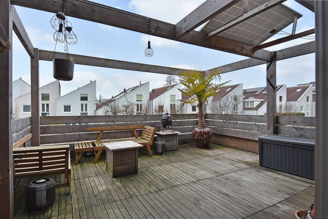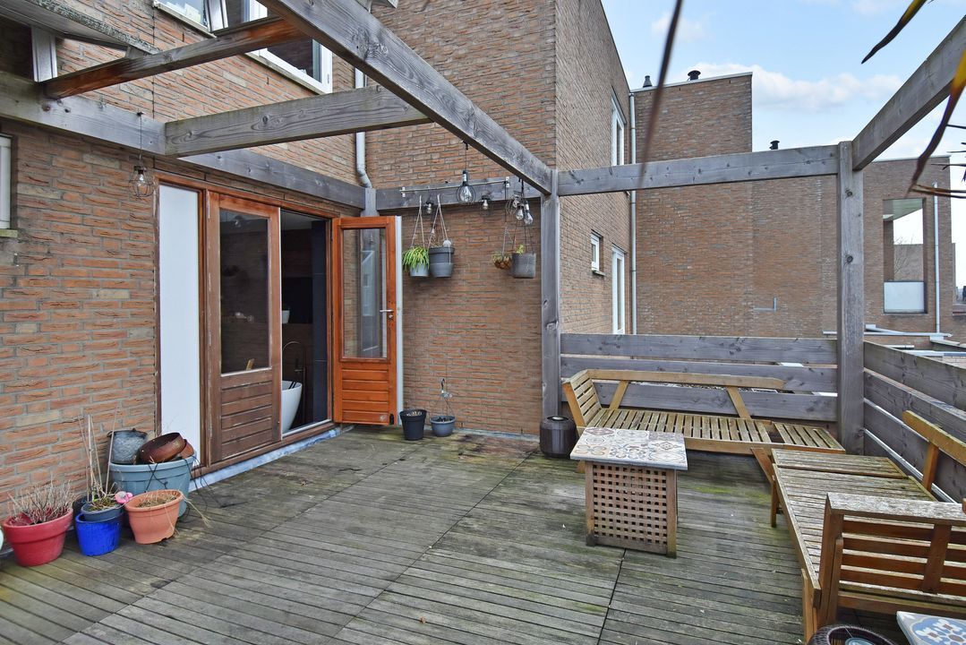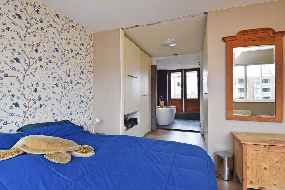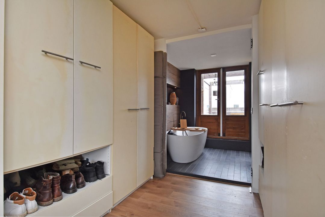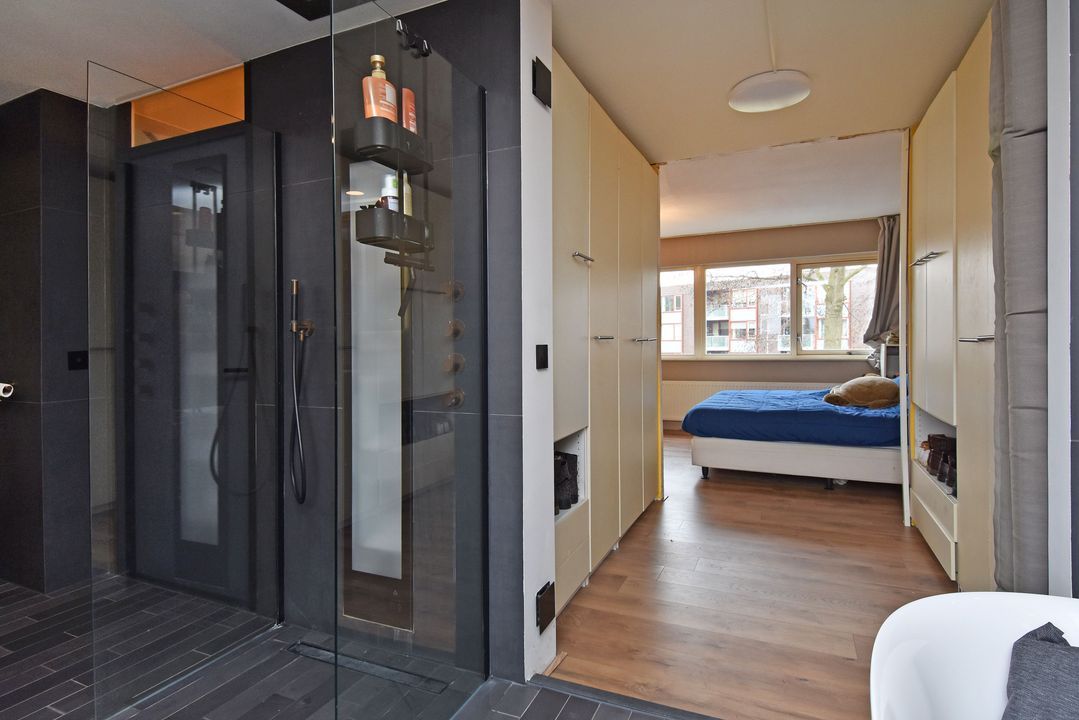 Overloop met open houten trapopgang en laminaatvloer. Voorslaapkamer met laminaatvloer en vrij uitzicht en aangrenzende walk-in closet. Aan de achterzijde ligt de volledig betegelde openbadkamer (2023) met twee openslaande deuren naar het zonnige dakterras van circa 24m2 op het zuidzuidwesten. De badkamer is voorzien van een vrijstaand ligbad met thermostaatkraan, inbouwnisjes met inbouwspots, zwevend toilet, breed badkamermeubel met twee waskommen en twee spiegels. Alle kranen zijn inbouw, twee inloopdouches met easydrains, hand- en stortdouche, infrarood/UV-Sunshower douche en een handdoekradiator.