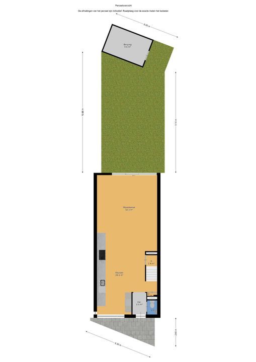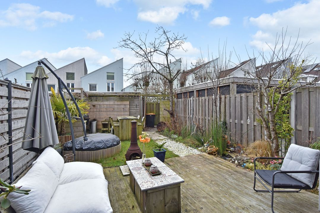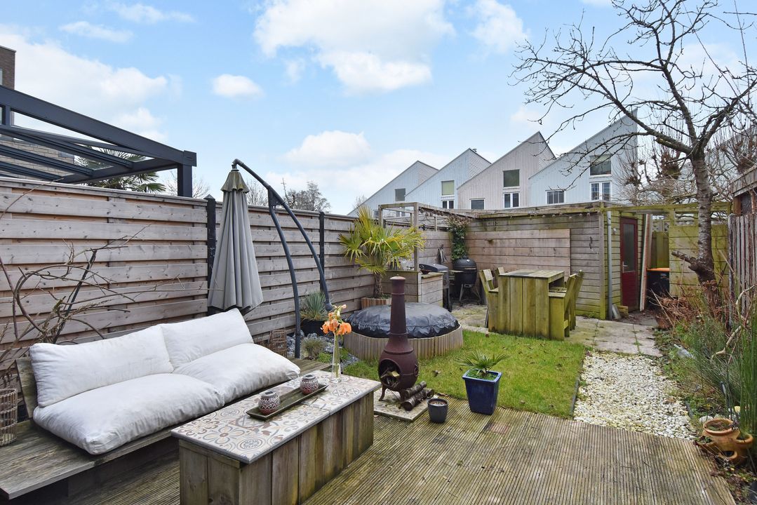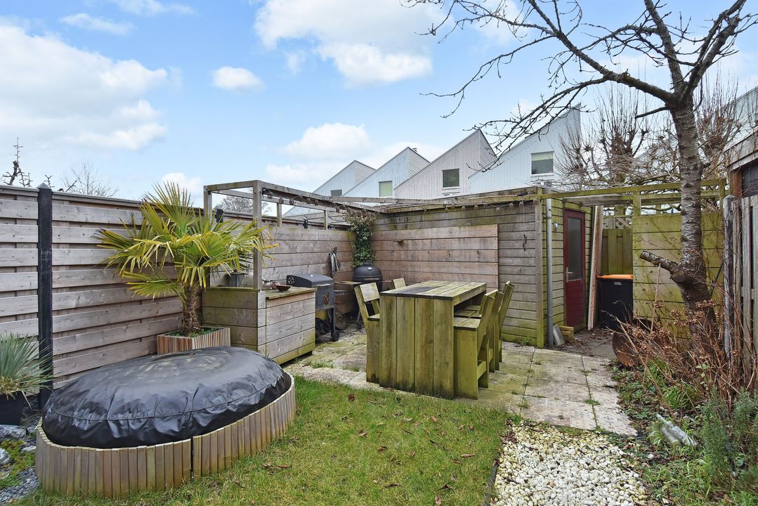 - De achtertuin ligt op het zuidzuidwesten met een vrijstaande houten berging en achterom