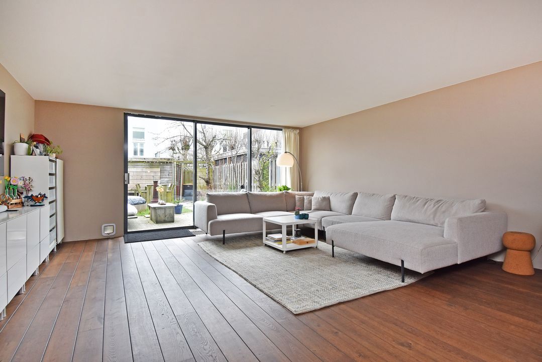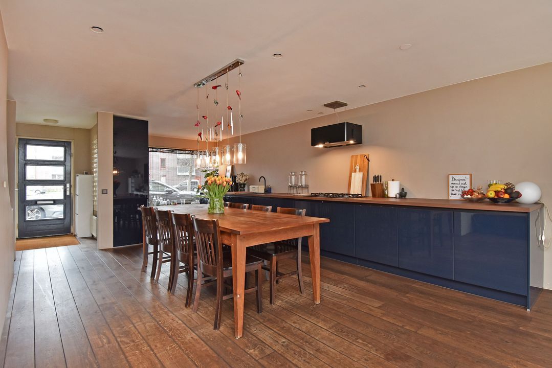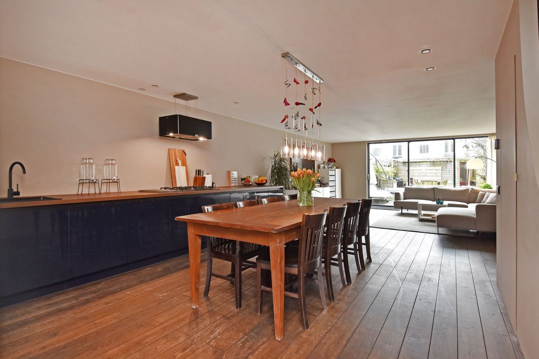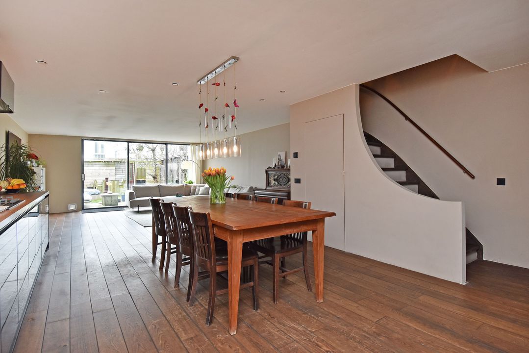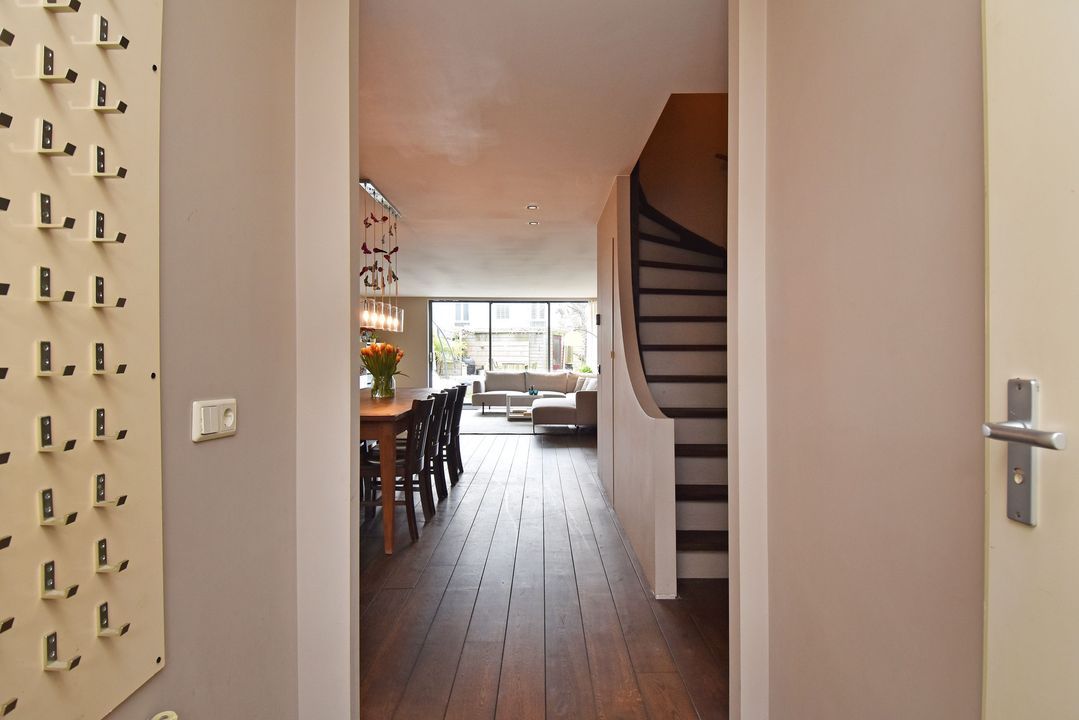 Voortuin met strookje groen. Entree, open hal met half betegelde toiletruimte en een fonteintje, meterkast met inverter voor de 8 pv zonnepanelen en een opentrapopgang naar de eerste verdieping. Directe toegang tot de aan de voorzijde van de woning gelegen ruime rechte opstelling keuken met diverse inbouwapparatuur, te weten: spoelbak met kraan, vaatwasser, 5-pits gaskookplaat met een recirculatie schouw, 2 koelkasten, 2 vriezers en een combi oven-/magnetron. De lichte sfeervolle tuingerichte brede woonkamer met een massief eiken parketvloer met convectorput en een aluminium schuifpui naar de fraai aangelegde achtertuin op het zuidzuidwesten met berging en achterom.