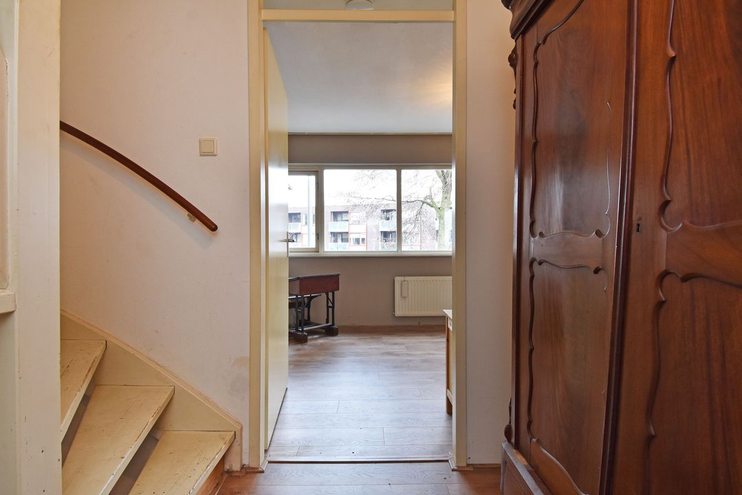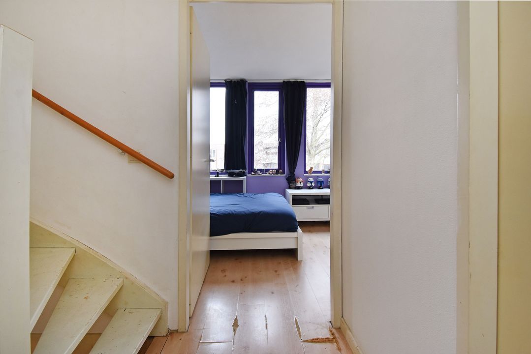 Overloop met open trapopgang en laminaatvloer. Aparte was-, stook- en bergruimte met opstelplaats voor wasmachine, droger, WTW-unit, CV-Combiketel (Remeha 2000??, huur). Aan de achterzijde een slaapkamer en aan de voorzijde een royale slaapkamer met vrij uitzicht over de singel.