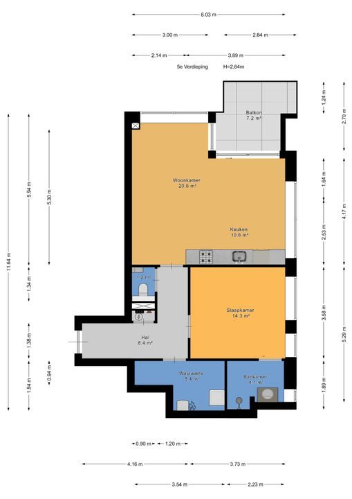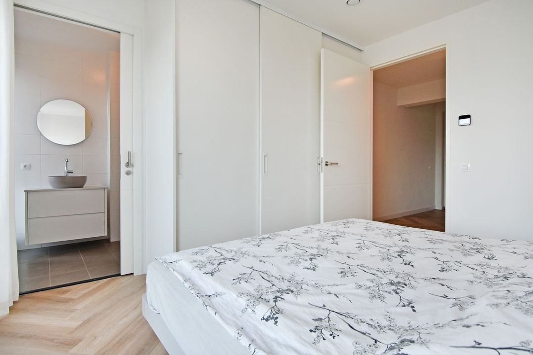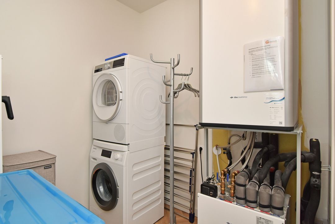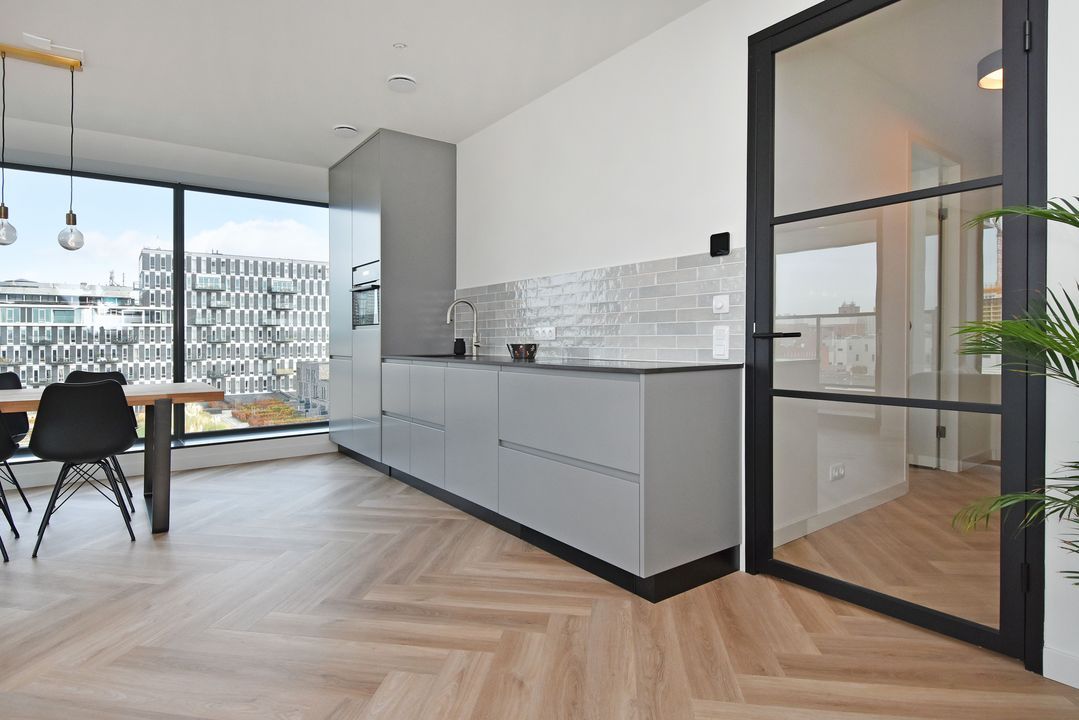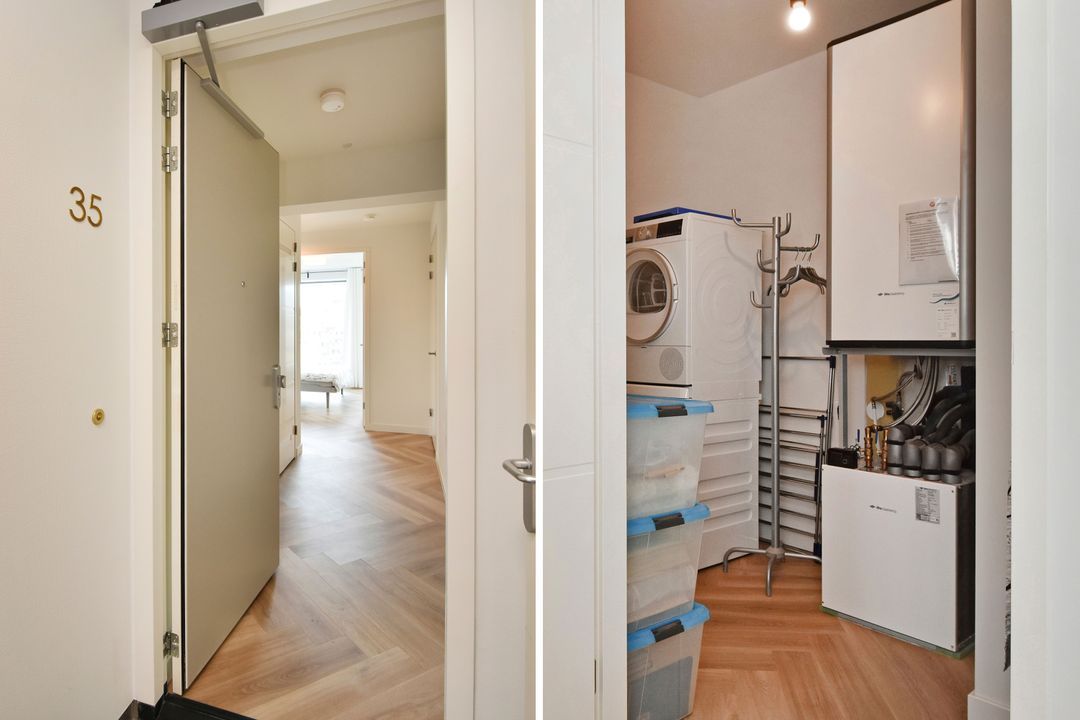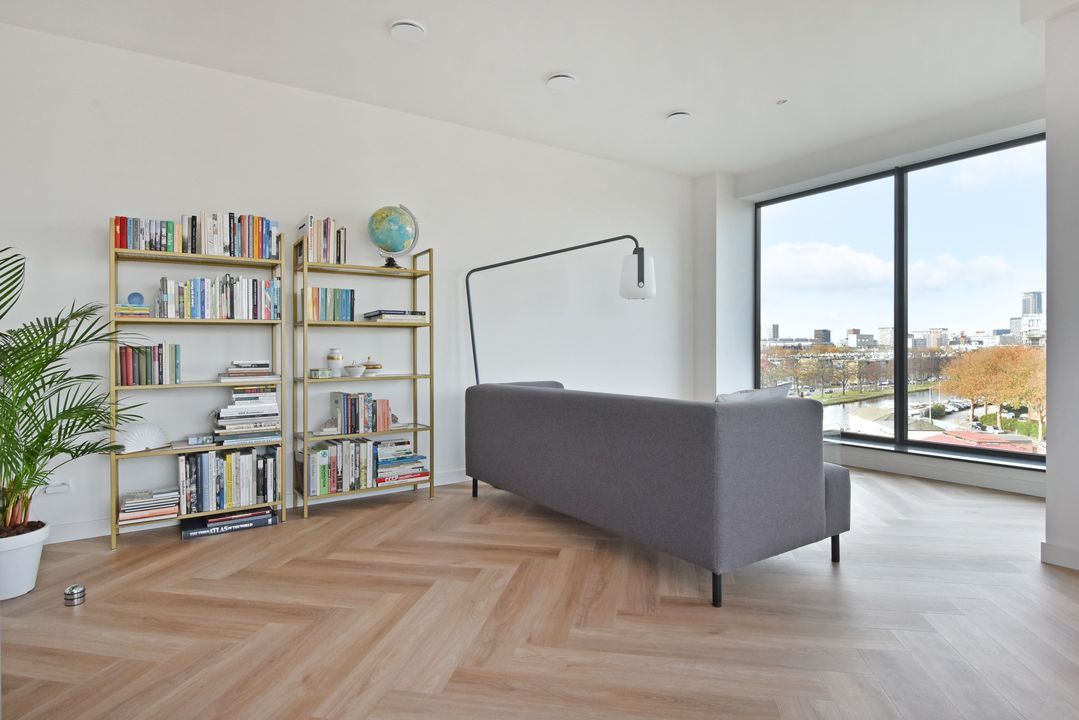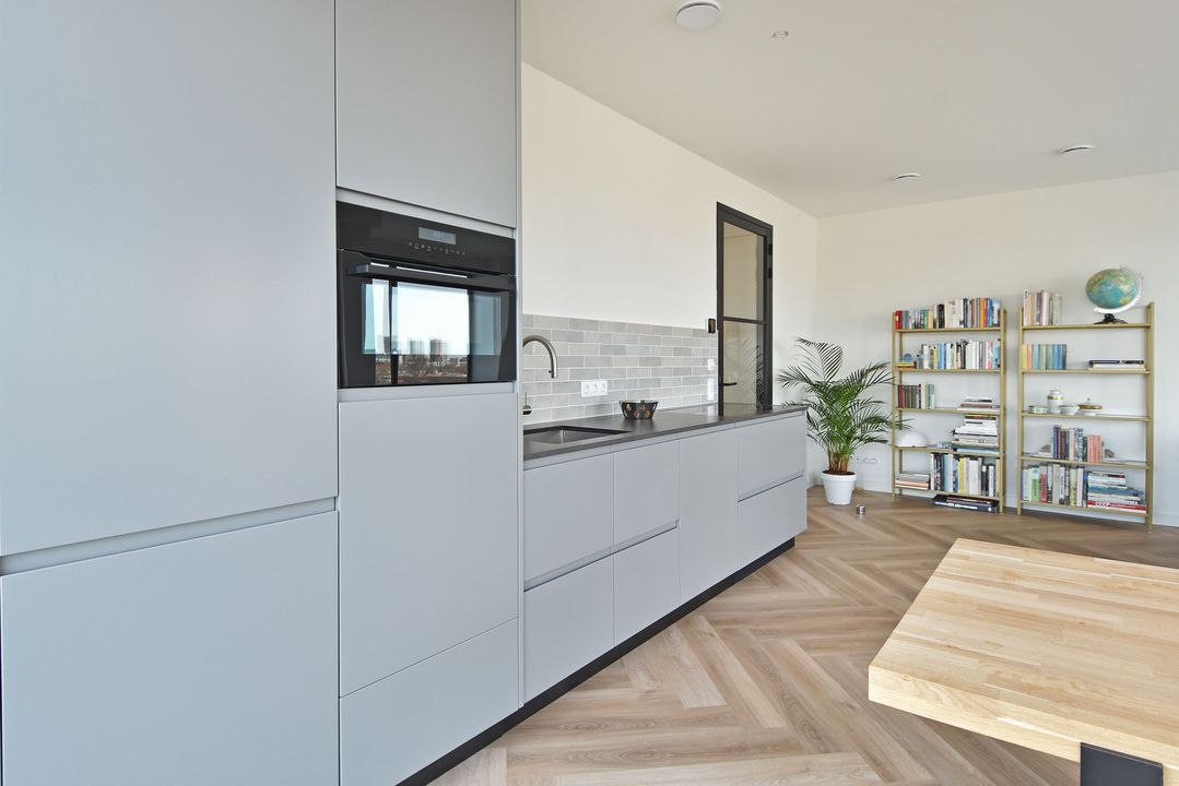 Entrance to the apartment, spacious hall with beautiful herringbone PVC flooring throughout the apartment and meter cupboard. Modern, fully tiled toilet with floating toilet and corner sink. Indoor storage/laundry room with space for heat recovery unit, washing machine, dryer, and Itho Daalderop heat pump with Itho Daalderop boiler. Bright living room with large windows, unobstructed view over the water and towards the skyline and center of The Hague. Sliding doors give access to the sunny northwest-facing balcony. The custom-made kitchen is equipped with a composite countertop and built-in appliances, namely: sink, Quooker, combi oven/microwave, dishwasher, refrigerator with two freezer drawers (Liebherr), and a 90 cm wide induction hob with built-in extraction system (NOVY). Bright bedroom with large windows and custom-made built-in wardrobe. A sliding door leads to the fully tiled bathroom with walk-in shower with easydrain, built-in niche, thermostatic tap and hand and rain shower, bathroom cabinet with two drawers, washbasin and high tap, natural stone countertop and electric heating.