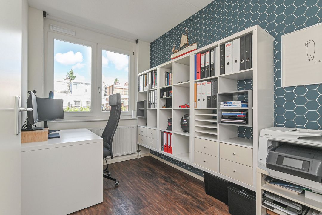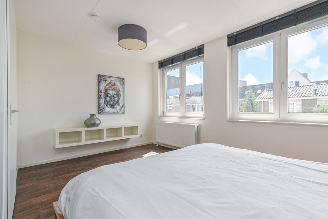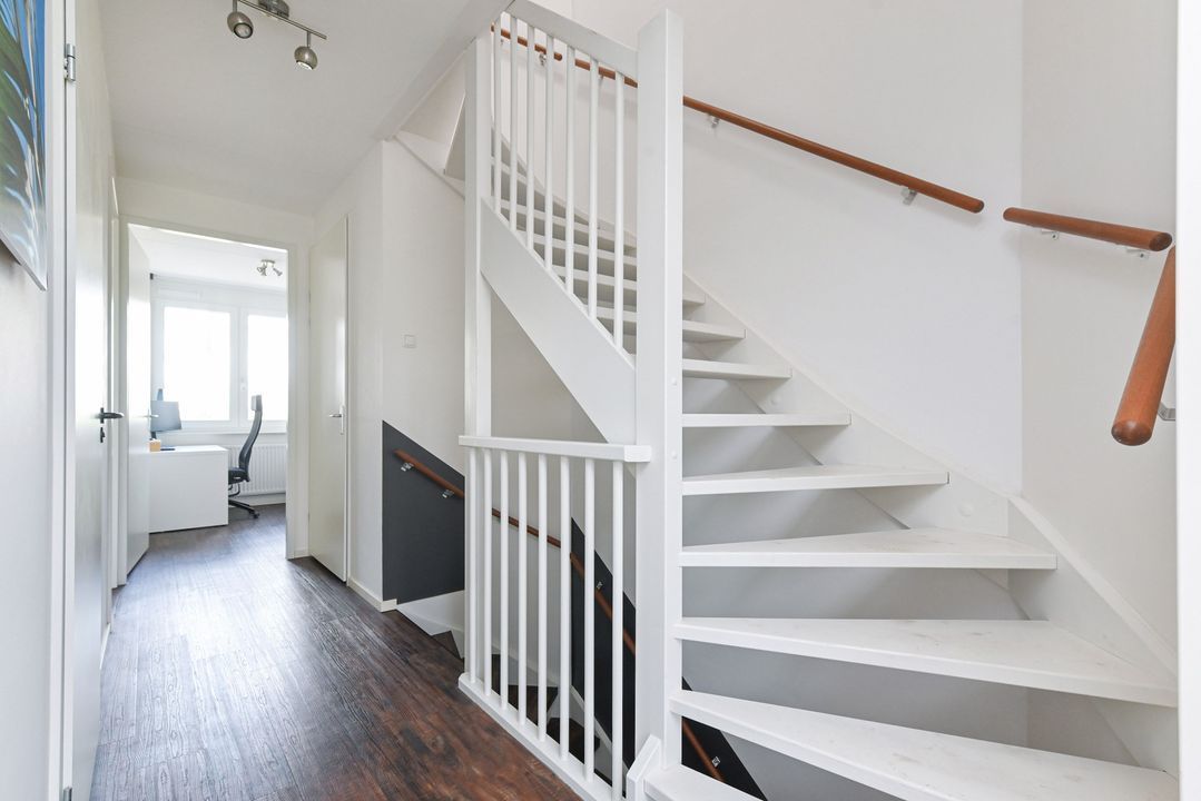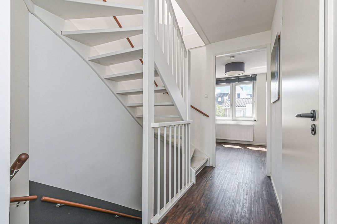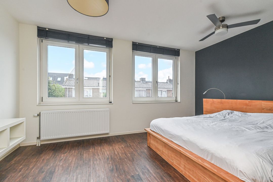 Overloop met laminaatvloer en open trapopgang naar het ruime dakterras. Stookkast met opstelplaats voor CV-Combiketel (Remeha Tzerra CW5 2016), mechanische ventilatie unit (DUCO) en inverter voor de 11 pv zonnepanelen. Moderne 2e badkamer voorzien van douchecabine met thermostaatkraan en hand- en stortdouche, badkamermeubel met wastafel, elektrische radiator, Velux-dakraam en opstelplaats voor wasmachine en droger. Ruime achterslaapkamer met laminaatvloer en twee Velux-dakramen. Inpandige berging. Ruime voorslaapkamer met laminaat en dakkapel.