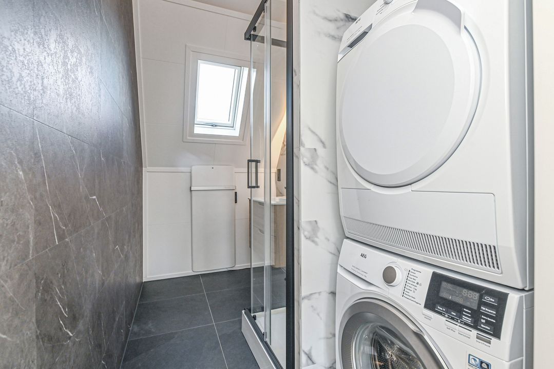 Landing with laminate flooring and open staircase to the spacious roof terrace. Boiler room with space for central heating combi boiler (Remeha Tzerra CW5 2016), mechanical ventilation unit (DUCO), and inverter for the PV solar panels. Modern second bathroom with shower cabin with thermostatic tap and hand and rain shower, bathroom cabinet with sink, electric radiator, Velux skylight, and space for washing machine and dryer. Spacious rear bedroom with laminate flooring and two Velux skylights. Indoor storage room. Spacious front bedroom with laminate flooring and dormer window.