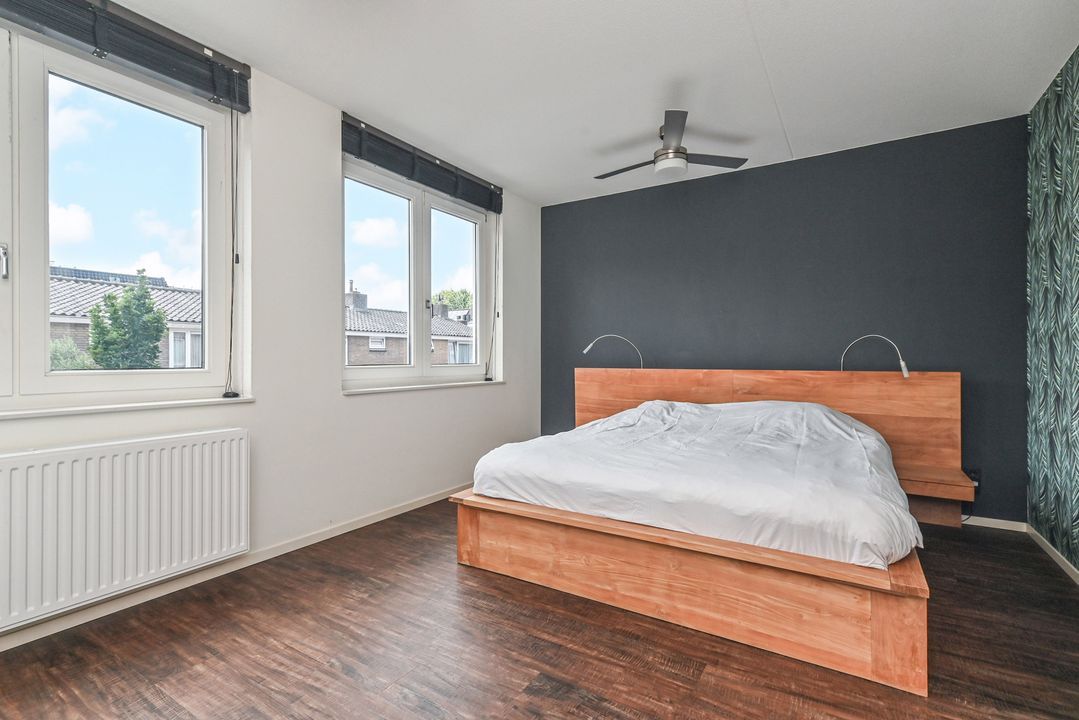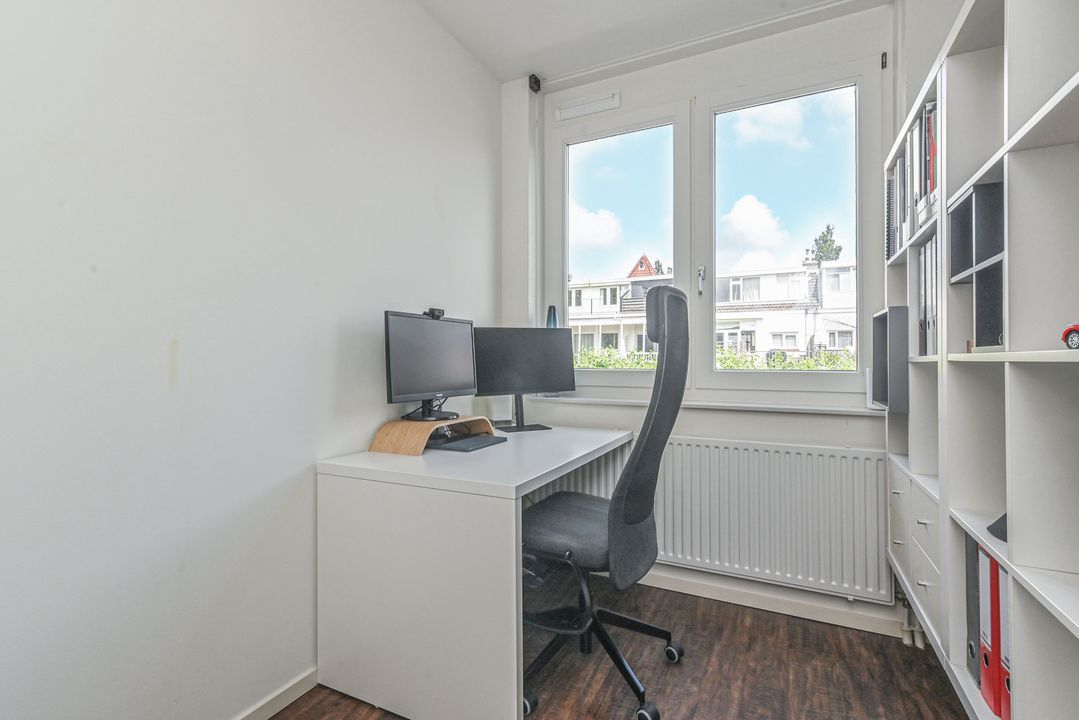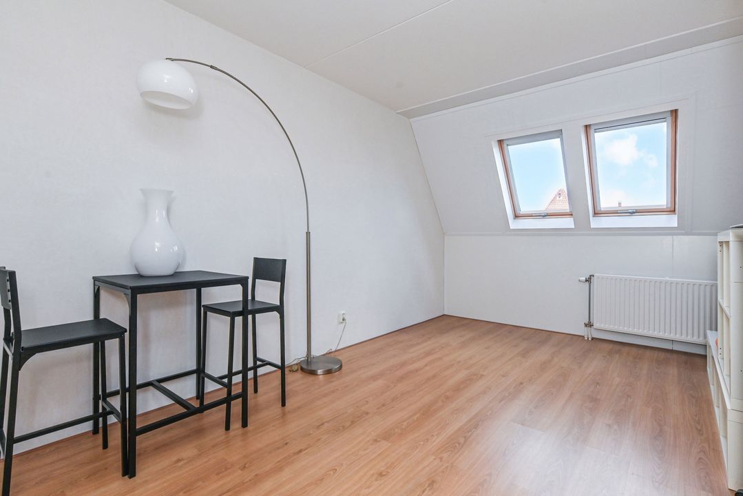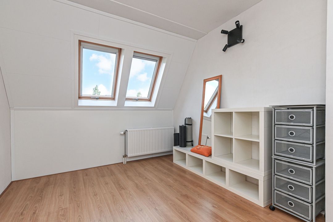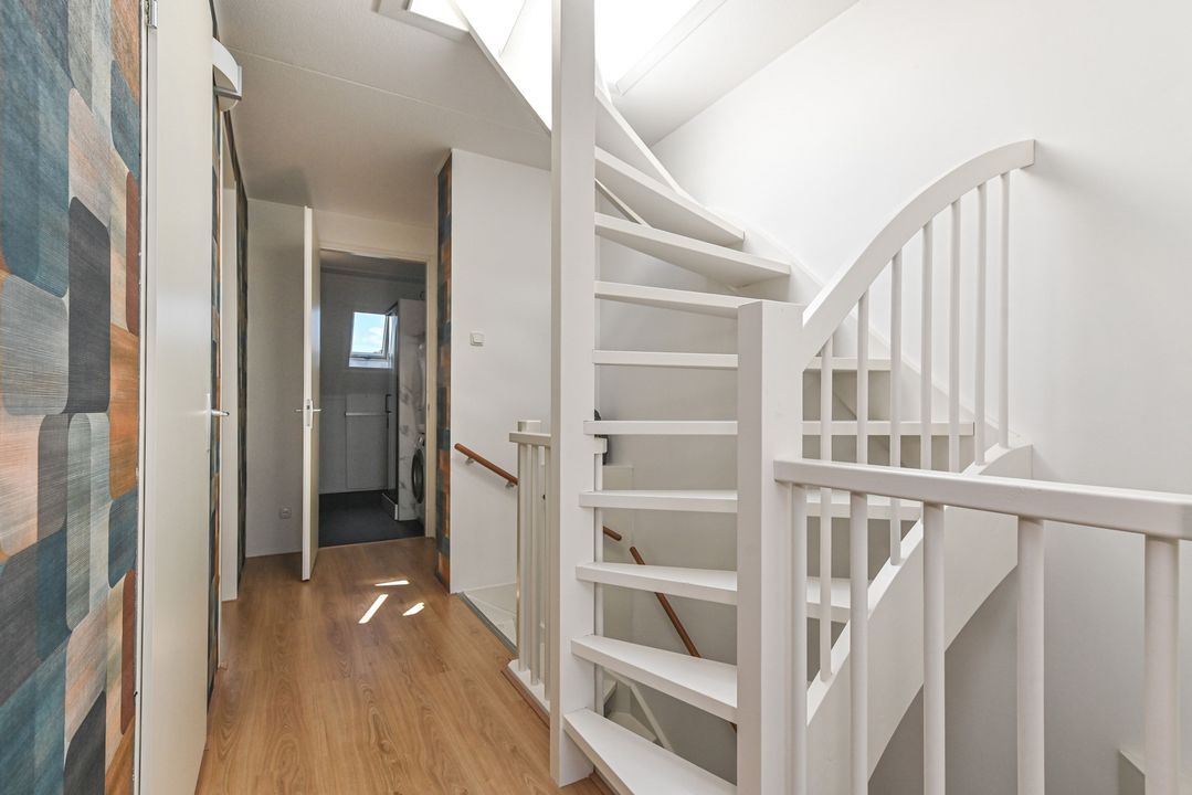 Overloop met laminaatvloer en open trapopgang naar het ruime dakterras. Stookkast met opstelplaats voor CV-Combiketel (Remeha Tzerra CW5 2016), mechanische ventilatie unit (DUCO) en inverter voor de 11 pv zonnepanelen. Moderne 2e badkamer voorzien van douchecabine met thermostaatkraan en hand- en stortdouche, badkamermeubel met wastafel, elektrische radiator, Velux-dakraam en opstelplaats voor wasmachine en droger. Ruime achterslaapkamer met laminaatvloer en twee Velux-dakramen. Inpandige berging. Ruime voorslaapkamer met laminaat en dakkapel.