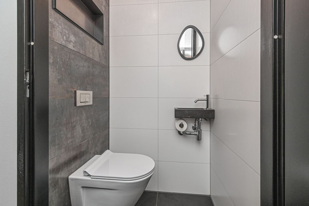 Spacious landing with PVC flooring and open staircase. Modern, fully tiled toilet room with floating toilet and washbasin. Spacious front bedroom with PVC flooring. Modern, fully tiled bathroom with underfloor heating, bathtub with thermostat tap, spacious walk-in shower with glass door, easydrain and hand and rain shower, a wide sink with two taps, two drawers and a mirror cabinet, and a suspended ceiling with recessed spotlights. Two rear bedrooms, both with PVC flooring.