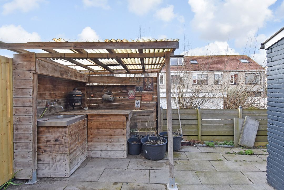 Betegelde voortuin. Entree-/hal met toilet en hoekfonteintje, trapkast, meterkast en vaste trapopgang. Lichte tuingerichte woonkamer voorzien van houtkachel, parketvloer en 2 openslaande deuren naar achtertuin. Uitgebouwde bijkeuken met deur naar achtertuin en aansluiting wasmachine en hoekkeuken met spoelbak, gaskookplaat, afzuigschouw, oven-/magnetron. Betegelde achtertuin op het westen met veranda, vrijstaande stenen berging en achterom.