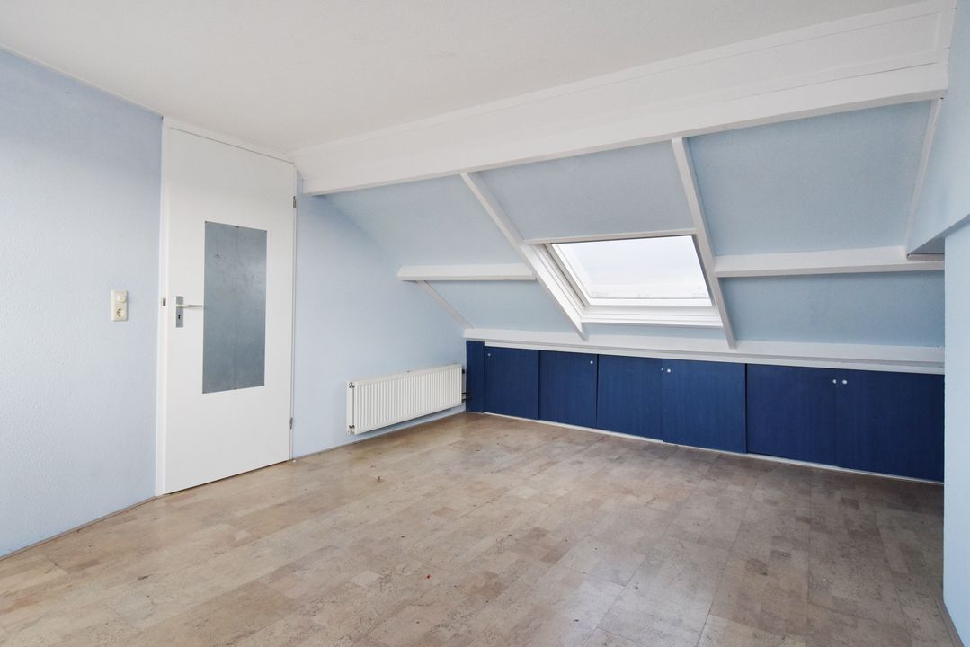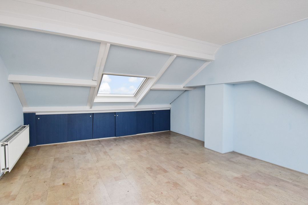 Ruime voorzolder met opstelplaats voor de CV-Combiketel. Aan de achterzijde ligt de ruime zolderkamer voorzien van laminaatvloer, knieschotten en Velux-dakraam en screen. Dakkapel over de gehele breedte van de achterzijde.