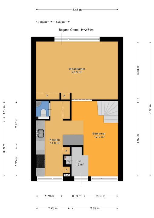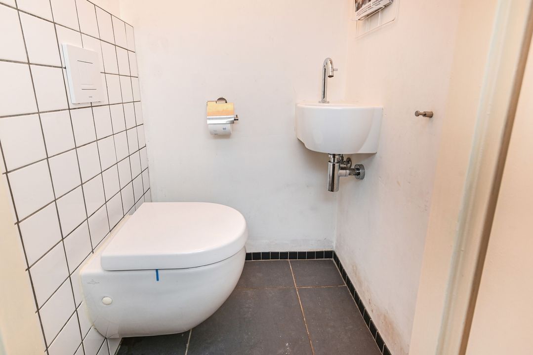 Voortuin. Entree met meterkast, garderobe en directe toegang tot de lichte eetkamer aan de voorzijde met aansluitend de ruime rechte opstelling keuken met diverse inbouwapparatuur, te weten: spoelbak met een voorspoeldouche kraan, vaatwasser, 5-pits gaskookplaat en een RVS afzuigkap. De keuken heeft een apart keukenblok met een inbouwoven (in 2023 vervangen), warmhoudlade, stoomoven, koelkast en vriezer. In de "tussenhal" is een vaste opbergkast en een toiletruimte met zwevend toilet en een fonteintje. De begane grond is voorzien van een gietvloer. In de doorgang van de eetkamer naar de woonkamer bevindt zich een open houtentrapopgang. De tuingerichte woonkamer aan de achterzijde geeft toegang tot de achtertuin met berging en achterom naar de privé parkeerplaats.