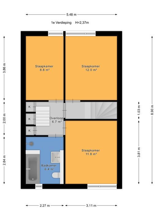 Overloop, met open houten trapopgang en vaste garderobekasten en laminaatvloer. Voorslaapkamer met laminaatvloer en vrij uitzicht. Volledig betegelde badkamer voorzien van een zwevend toilet, aparte douchecabine met thermostaat kraan, ligbad met thermostaatkraan, wastafel en een ventilatieraam. Twee ruime achterslaapkamers met laminaatvloer en vrij uitzicht.