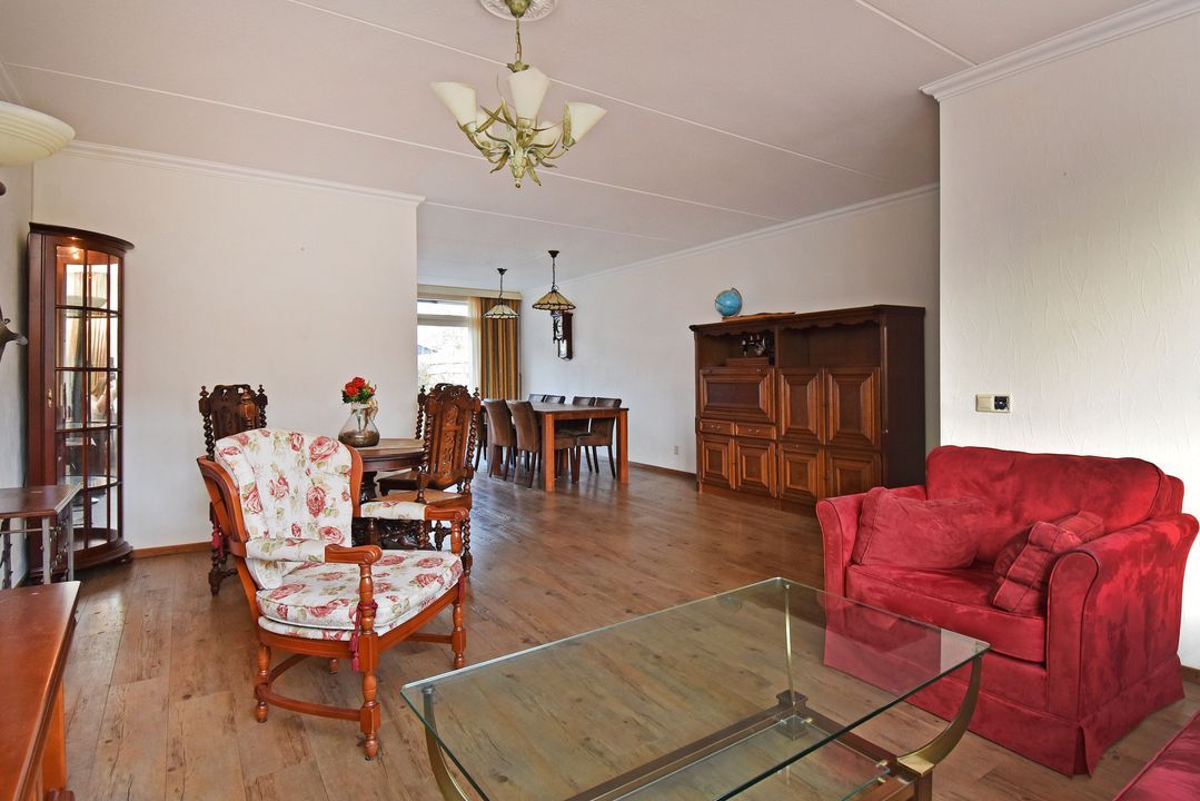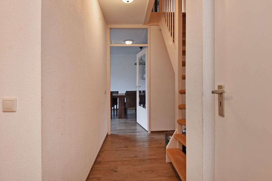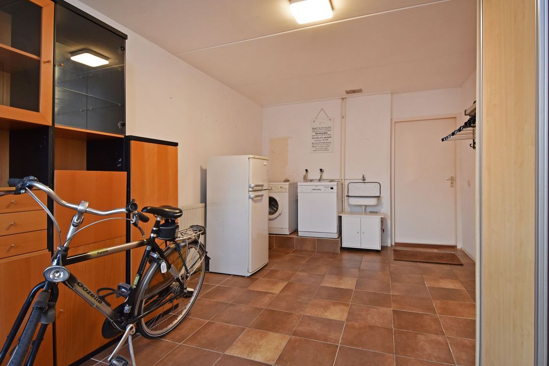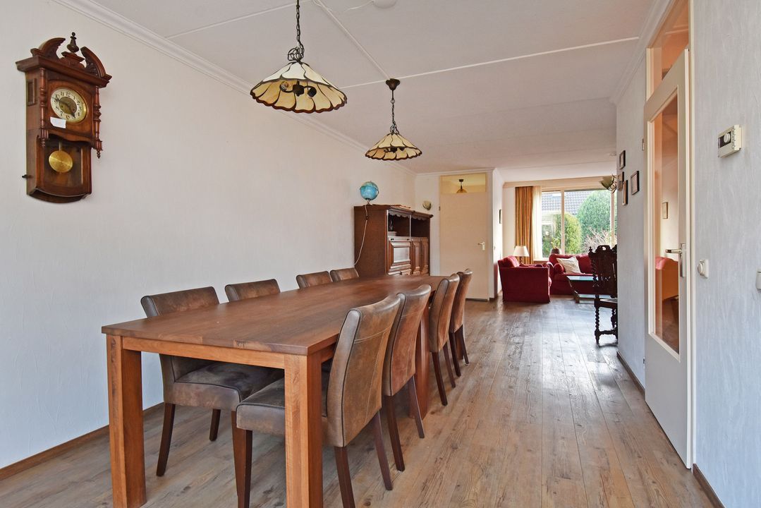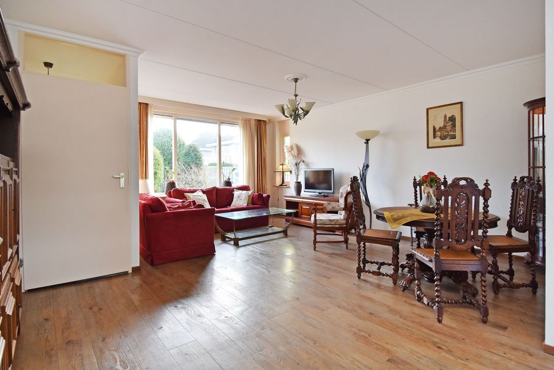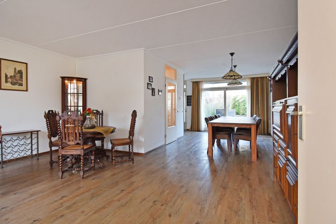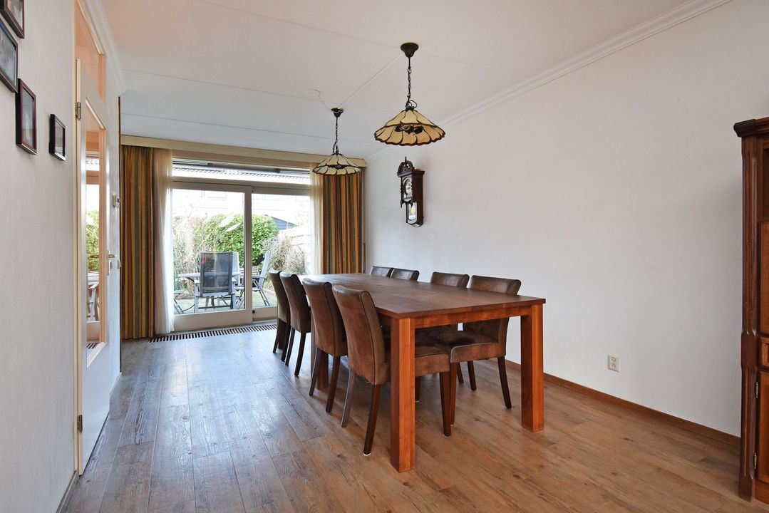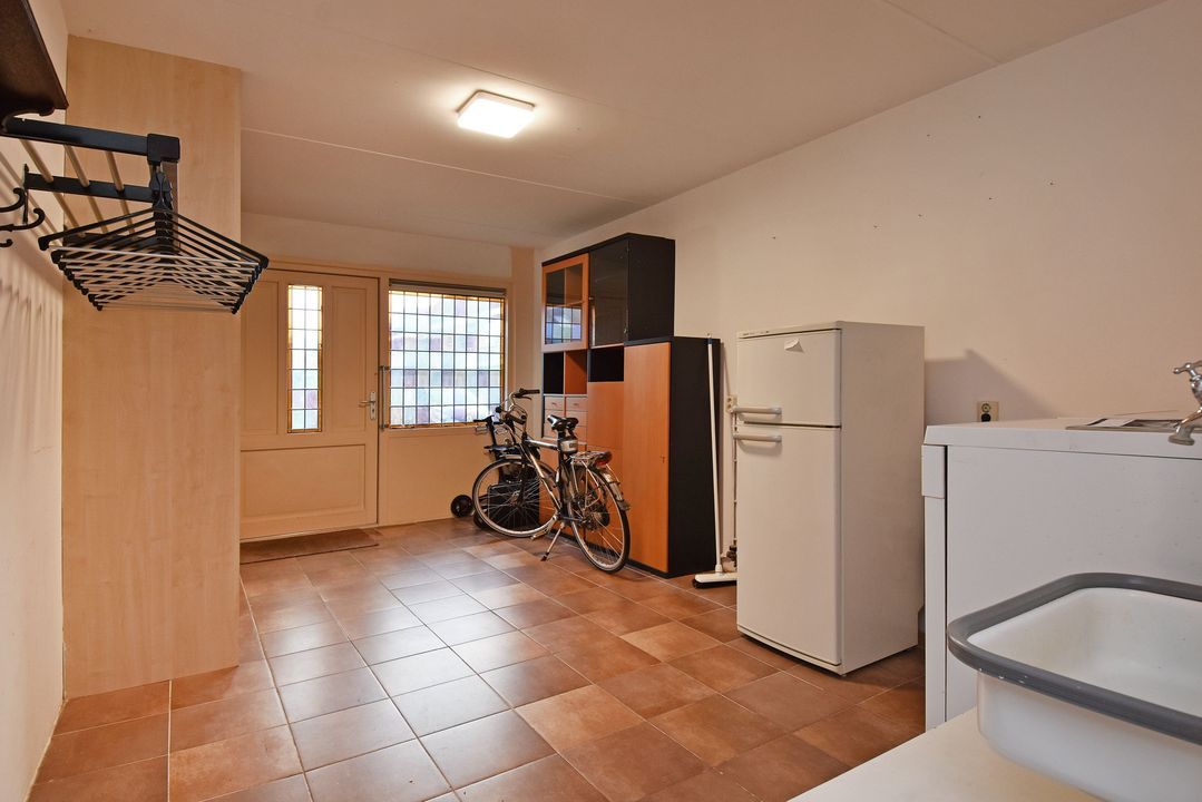 Voortuin. Entree/hal, voordeur met glas-in-lood, meterkast, garderobe en directe toegang tot de lichte woon- en eetkamer. De royale, L-vormige living van circa 42m2 voorzien van plavuizen vloer met vloerverwarming, convectorput en hardhouten schuifpui naar achtertuin. Aan de tuinzijde ligt de open hoekkeuken met plavuizen vloer en buitendeur naar de heerlijke achtertuin. De keuken is uitgevoerd met een dubbele spoelbak, koelkast met vriesvak, 5-pits gaskookplaat en vlakscherm afzuigkap. Ruime binnenhal met vaste trapopgang naar de 1e Verdieping. Ruime inpandige berging (voorheen garage) met plavuizen vloer, verwarming, wasbakje, aparte buitendeur naar de voortuin en aansluiting voor de wasmachine en droger. Half betegelde toiletruimte met zwevend toilet met fonteintje. Lichte, volledig betegelde badkamer voorzien van een handdoekradiator, wastafelmeubel met wastafel en spiegelkast, zwevend toilet, een douchcabine met glazen deur, een hand- en stortdouche met thermostaatkraan.