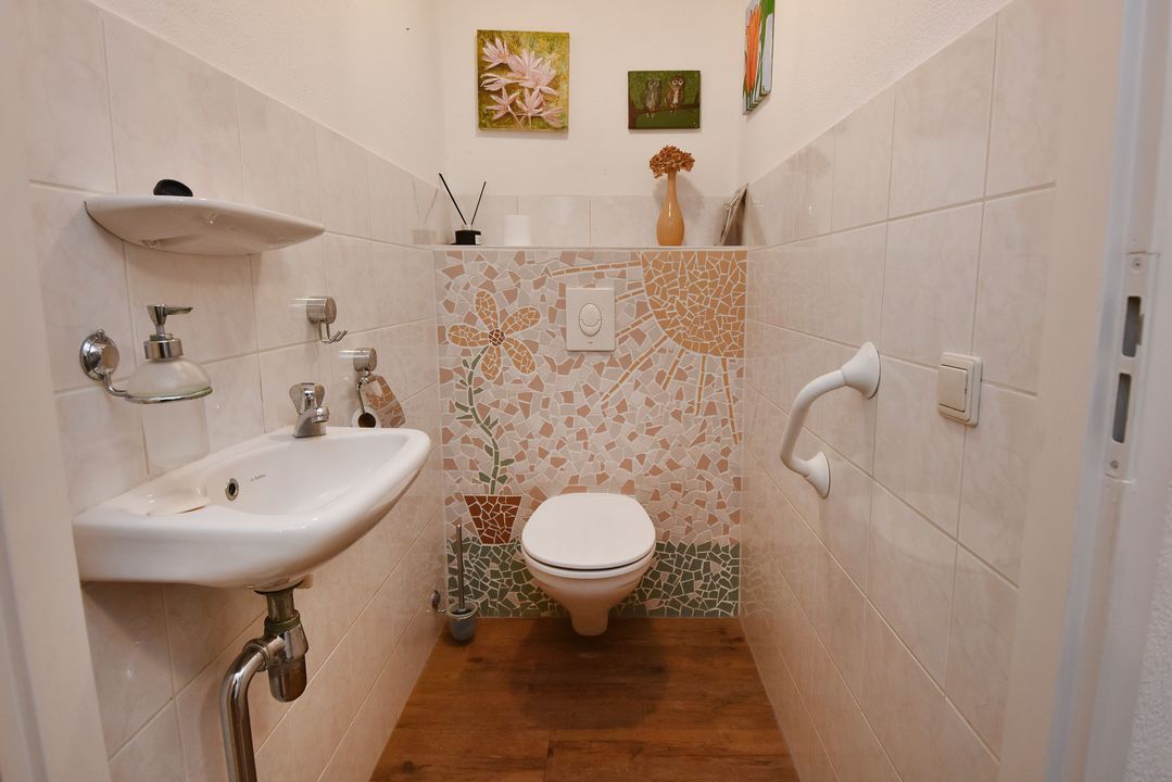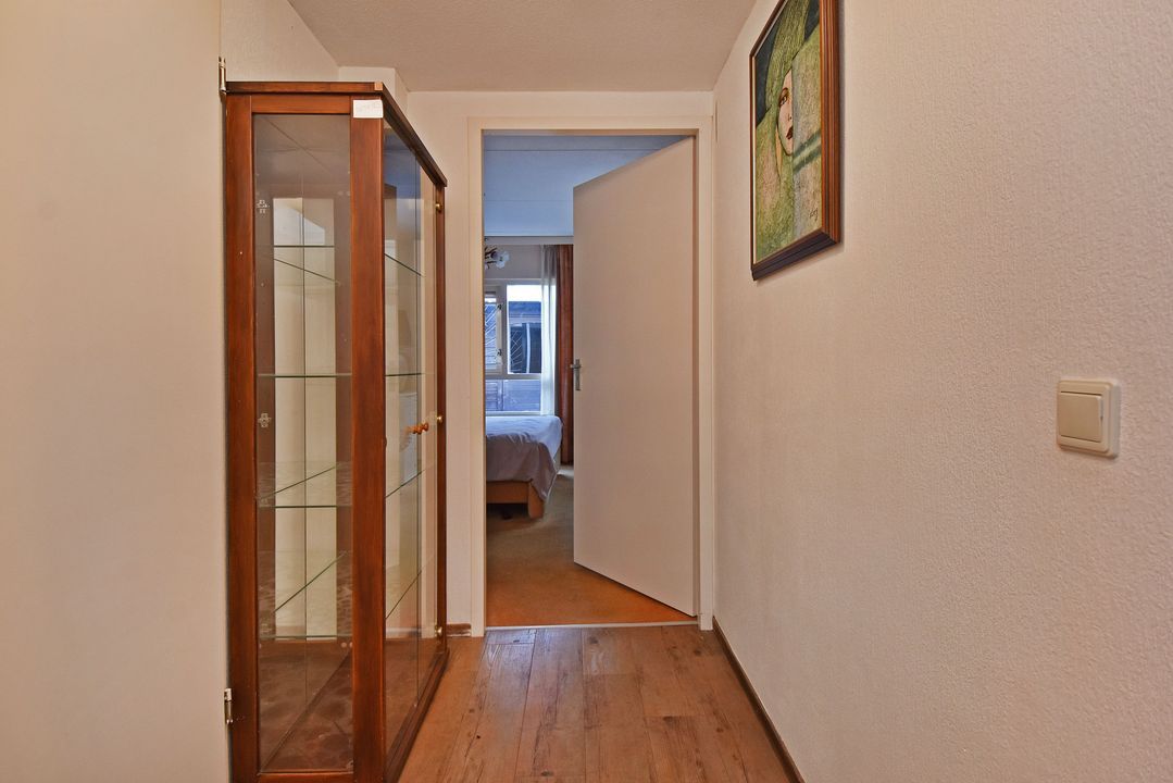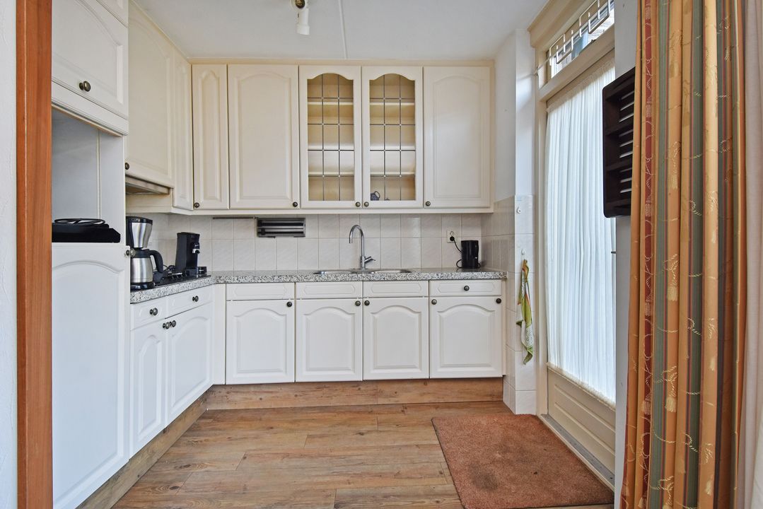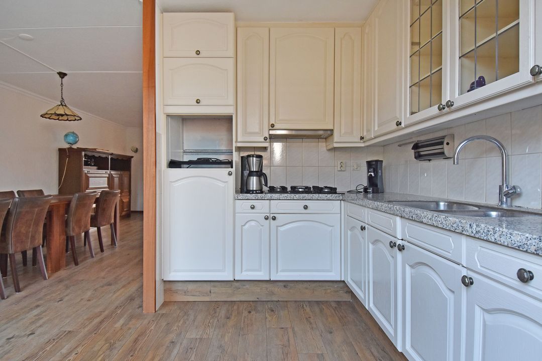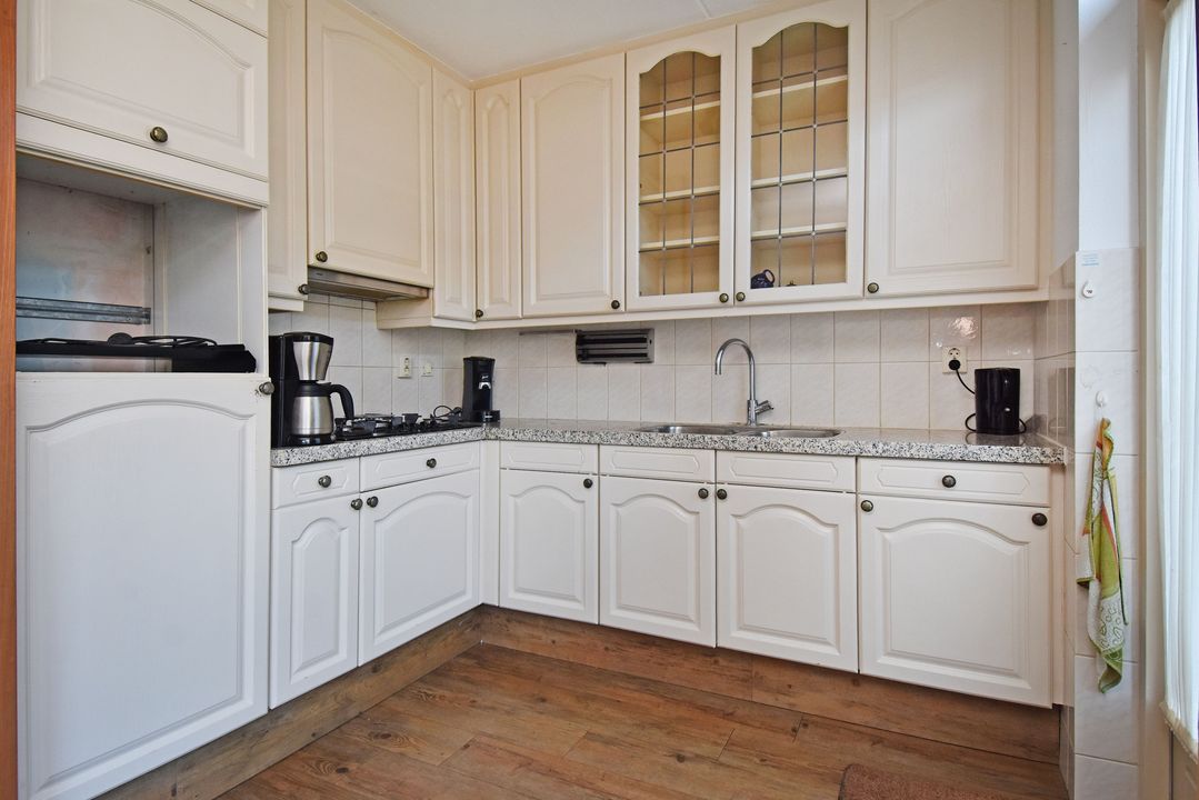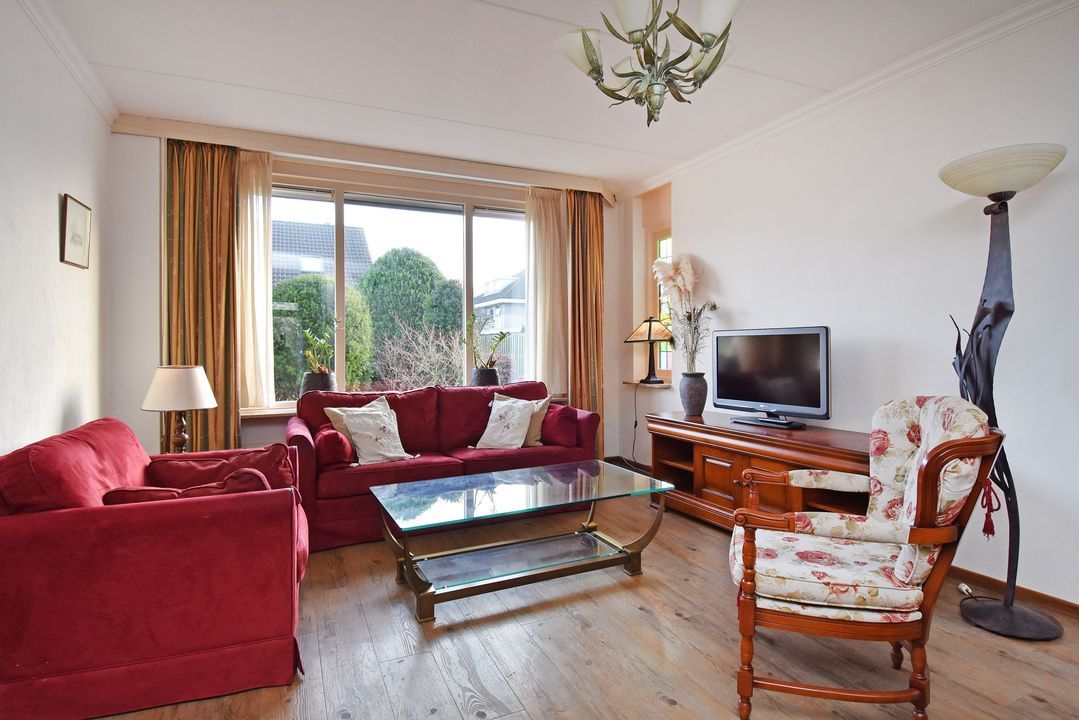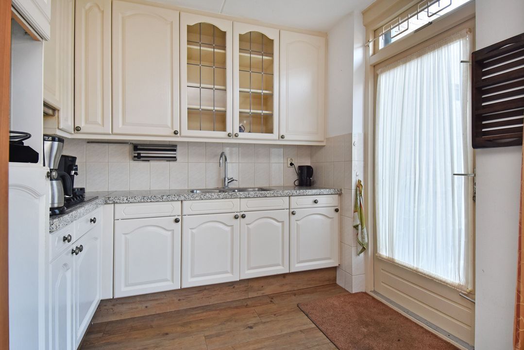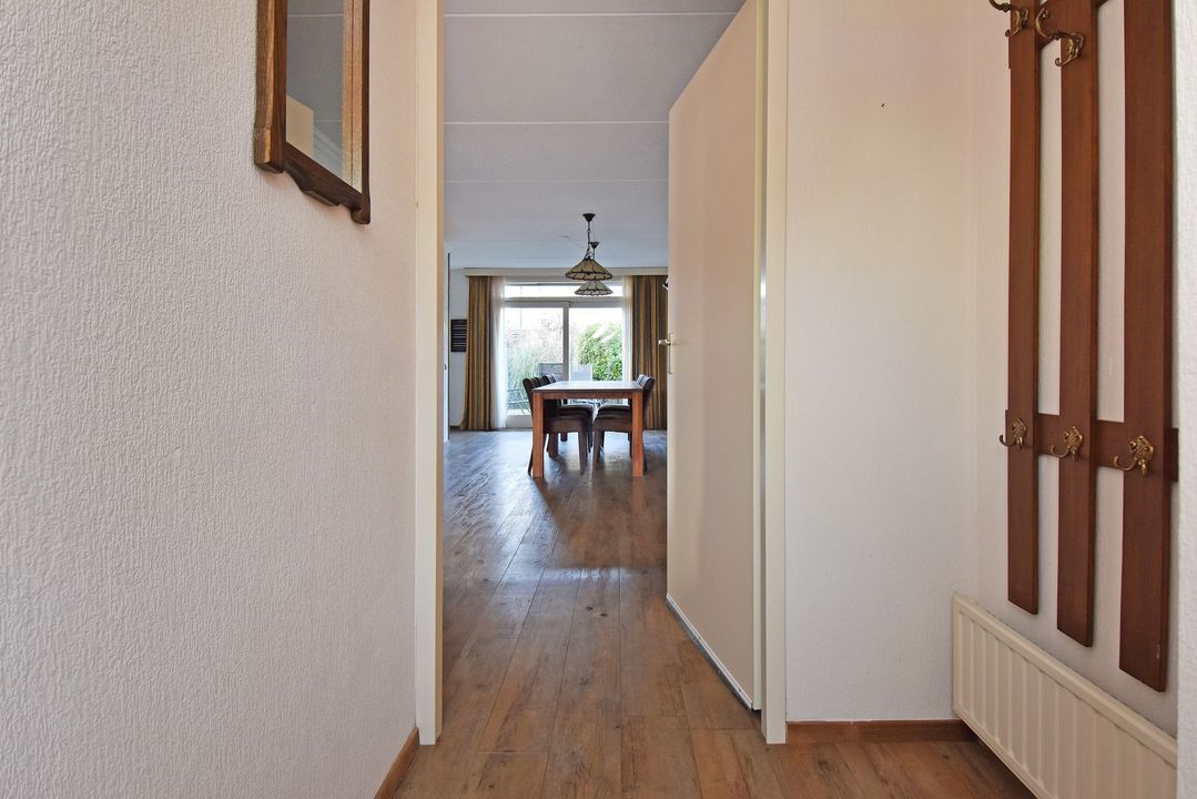 Voortuin. Entree/hal, voordeur met glas-in-lood, meterkast, garderobe en directe toegang tot de lichte woon- en eetkamer. De royale, L-vormige living van circa 42m2 voorzien van plavuizen vloer met vloerverwarming, convectorput en hardhouten schuifpui naar achtertuin. Aan de tuinzijde ligt de open hoekkeuken met plavuizen vloer en buitendeur naar de heerlijke achtertuin. De keuken is uitgevoerd met een dubbele spoelbak, koelkast met vriesvak, 5-pits gaskookplaat en vlakscherm afzuigkap. Ruime binnenhal met vaste trapopgang naar de 1e Verdieping. Ruime inpandige berging (voorheen garage) met plavuizen vloer, verwarming, wasbakje, aparte buitendeur naar de voortuin en aansluiting voor de wasmachine en droger. Half betegelde toiletruimte met zwevend toilet met fonteintje. Lichte, volledig betegelde badkamer voorzien van een handdoekradiator, wastafelmeubel met wastafel en spiegelkast, zwevend toilet, een douchcabine met glazen deur, een hand- en stortdouche met thermostaatkraan.