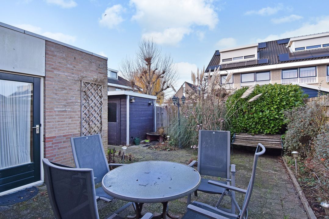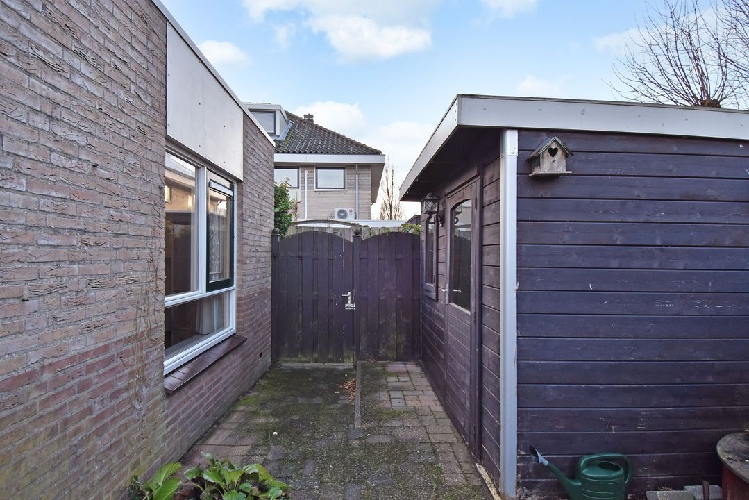 - De achtertuin ligt op het noordwesten met een vrijstaande houten berging en achterom via zijpoort