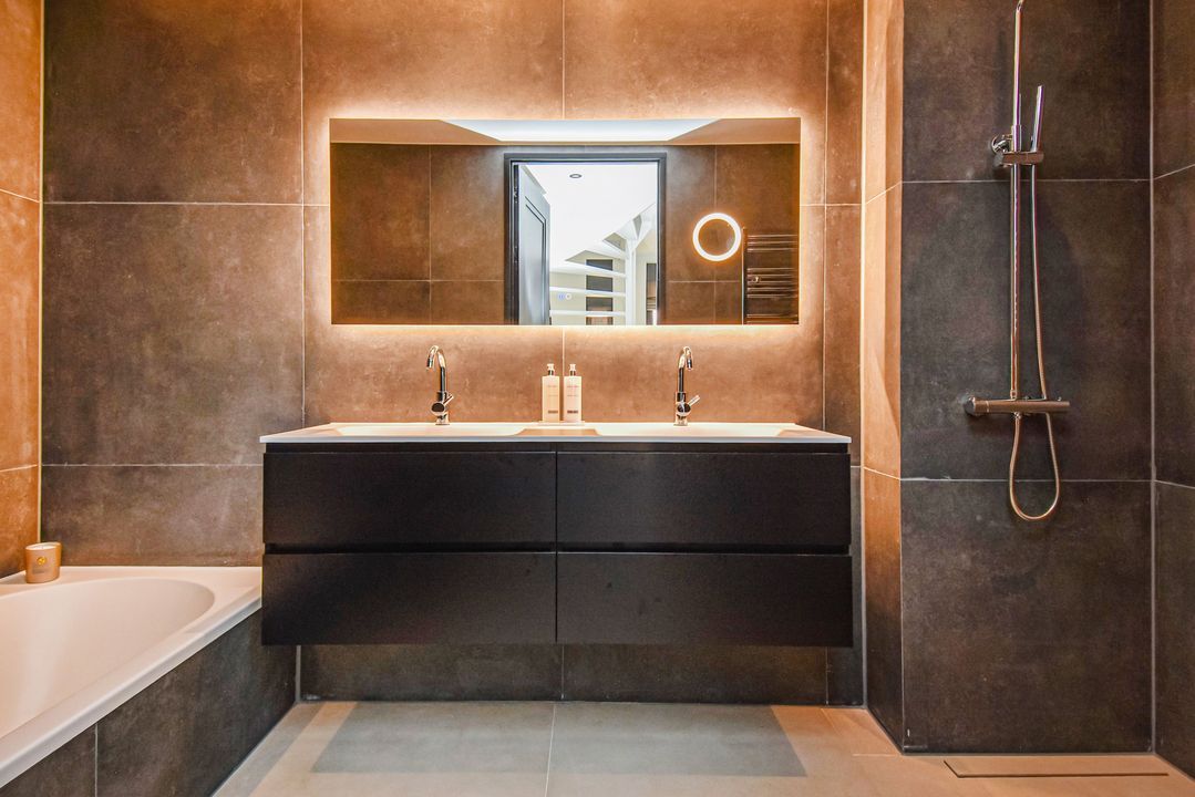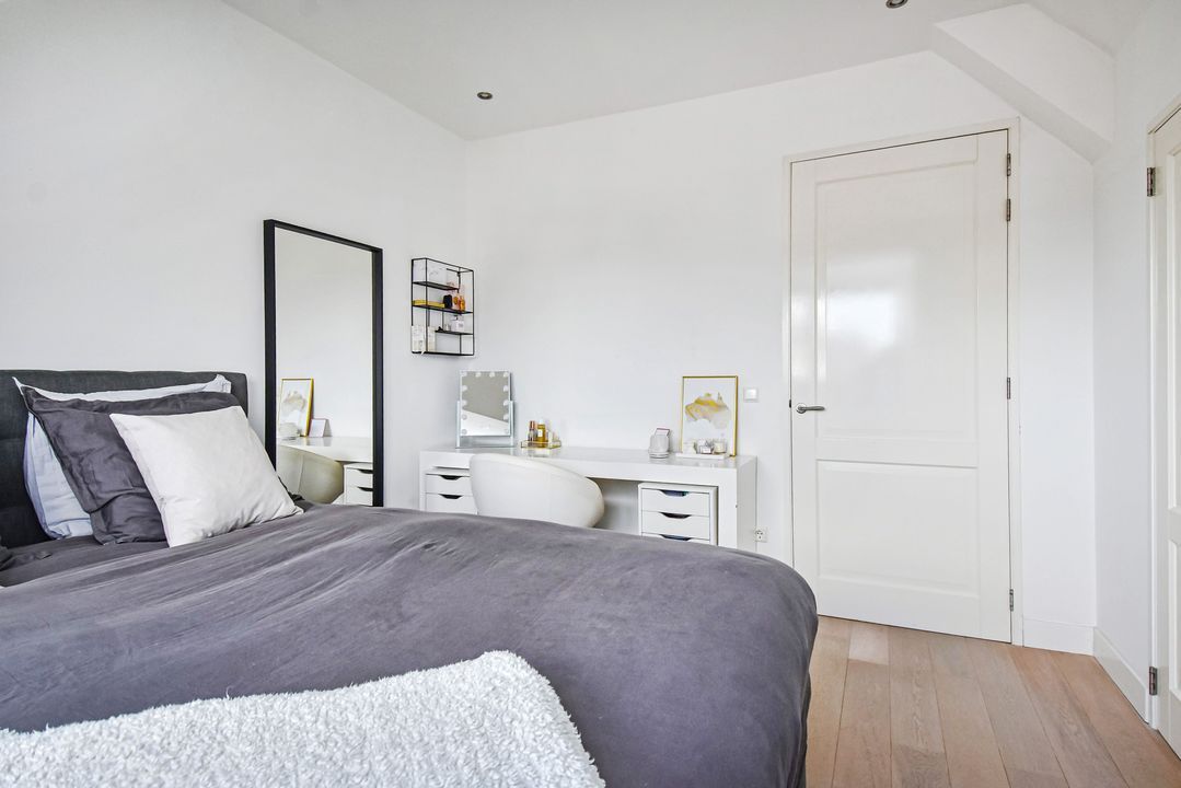 Ruime, lichte overloop voorzien van lichte eiken vloerdelen, nieuwe binnendeuren en een vaste trapopgang naar 2e verdieping. Toiletruimte voorzien van zwevend toilet met fonteintje. Royale ouderslaapkamer aan de achterzijde met lichte eiken vloerdelen en vaste garderobekast. Moderne, volledig betegelde badkamer (2025) voorzien van ligbad met thermostaatkraan, inloopdouche met easydrain, thermostaatkraan en hand- en stortdouche, breed badkamermeubel met dubbele wastafel en brede spiegel, designradiator en verlaagd plafond met inbouwspots. 2 ruime voorslaapkamers, beide met lichte eiken vloerdelen en vrij uitzicht richting de voortuin en straat.