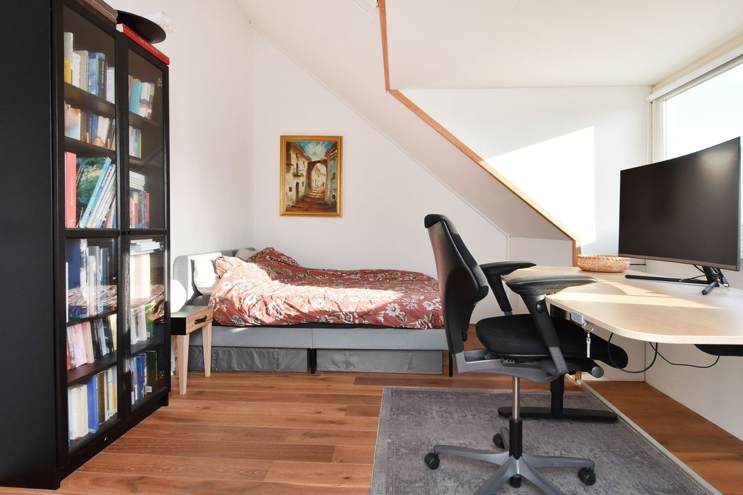 Spacious landing with wooden floor, knee walls, two Velux skylights, and space for the central heating combi boiler (Intergas 2008), washing machine, dryer, inverter for the PV solar panels, and mechanical ventilation unit. At the front is the fourth bedroom, which spans the entire width of the house and has wooden floorboards, a dormer window (with tilt and turn windows) and a sink.