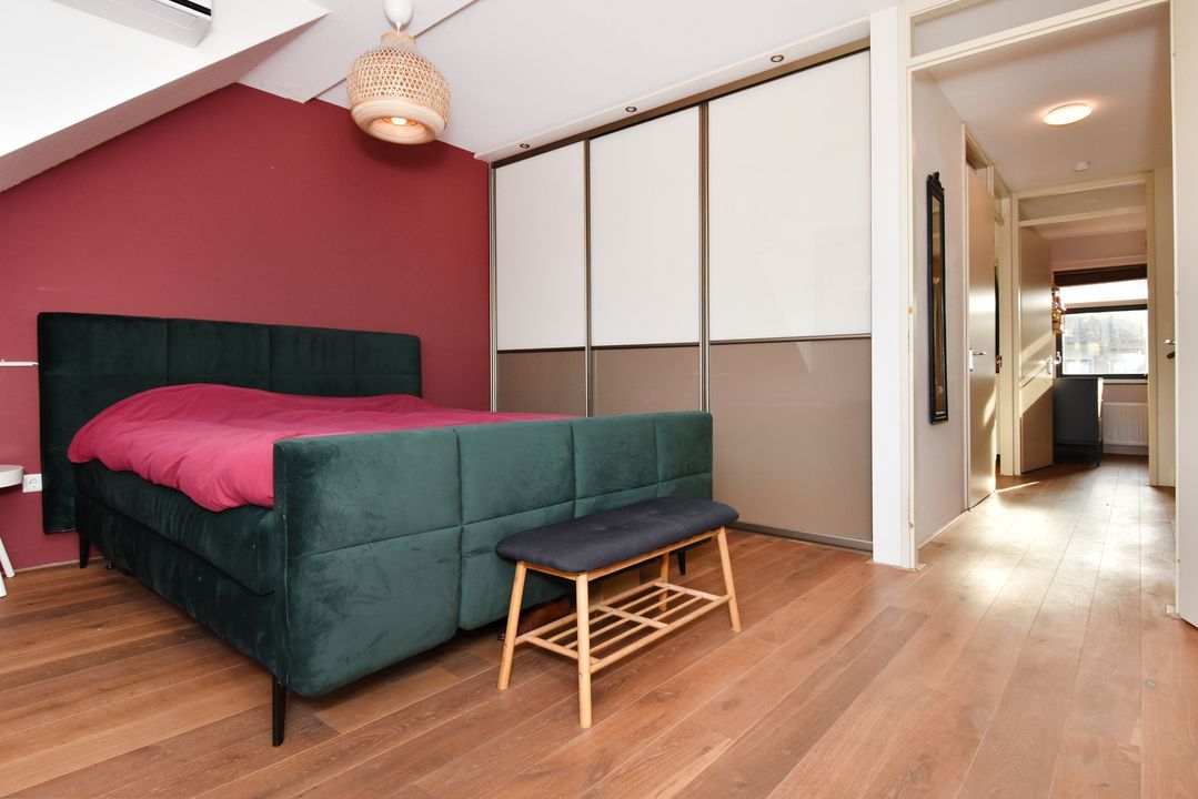 Overloop met massief houten vloerdelen en open trapopgang. Lichte, half betegelde toiletruimte met zwevend toilet en fonteintje. Ruime achterslaapkamer met houten vloerdelen, brede dakkapel (met draai- en kiepramen) en grote inbouwkast. Moderne, volledig betegelde badkamer voorzien van inloopdouche met glazen deur en hand- en stortdouche en thermostaatkraan, ligbad met thermostaatkraan, handdoekradiator, badkamermeubel met brede wastafel, kraan en spiegel. Aan de voorzijde bevinden zich nog twee slaapkamers, beide met houten vloerdelen.