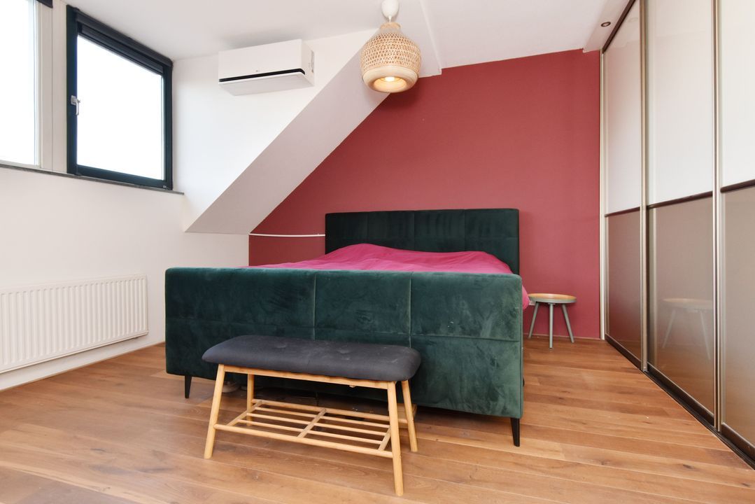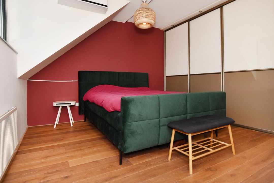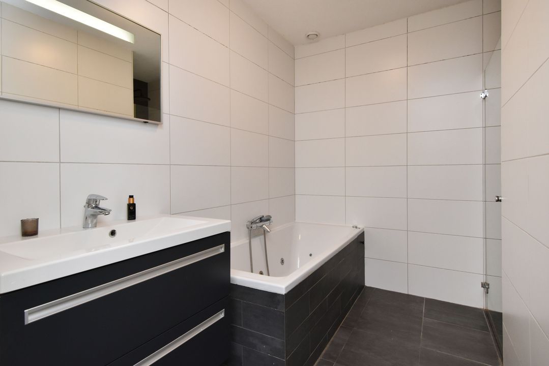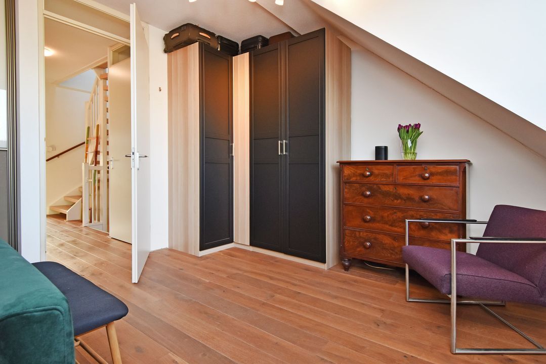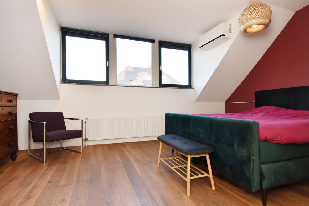 Overloop met massief houten vloerdelen en open trapopgang. Lichte, half betegelde toiletruimte met zwevend toilet en fonteintje. Ruime achterslaapkamer met houten vloerdelen, brede dakkapel (met draai- en kiepramen) en grote inbouwkast. Moderne, volledig betegelde badkamer voorzien van inloopdouche met glazen deur en hand- en stortdouche en thermostaatkraan, ligbad met thermostaatkraan, handdoekradiator, badkamermeubel met brede wastafel, kraan en spiegel. Aan de voorzijde bevinden zich nog twee slaapkamers, beide met houten vloerdelen.