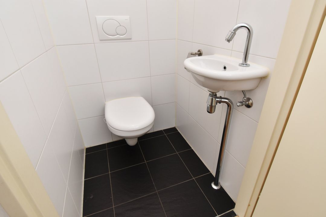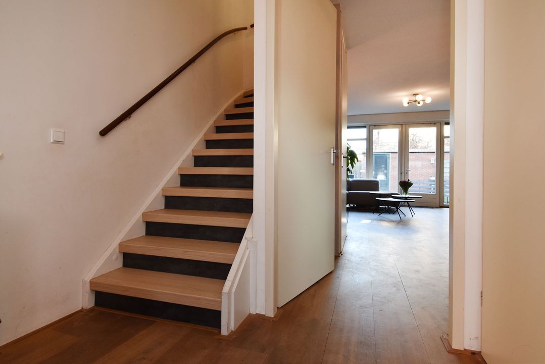 Entrance/hall with meter cupboard, wardrobe, and staircase. Bright, half-tiled toilet with floating toilet and washbasin. Spacious, garden-facing living room of approximately 37m2 with beautiful Chapel wooden floorboards, stair cupboard, and two French doors to the sunny backyard. This sunny backyard is approximately 10 meters deep and faces northwest. There is also an outside tap, a detached stone shed with electricity, and a back entrance through the gate. Modern, open corner kitchen with sink, combi oven/microwave, steam oven, 5-burner gas hob, stainless steel extractor hood (to the outside) and a dishwasher (2019).