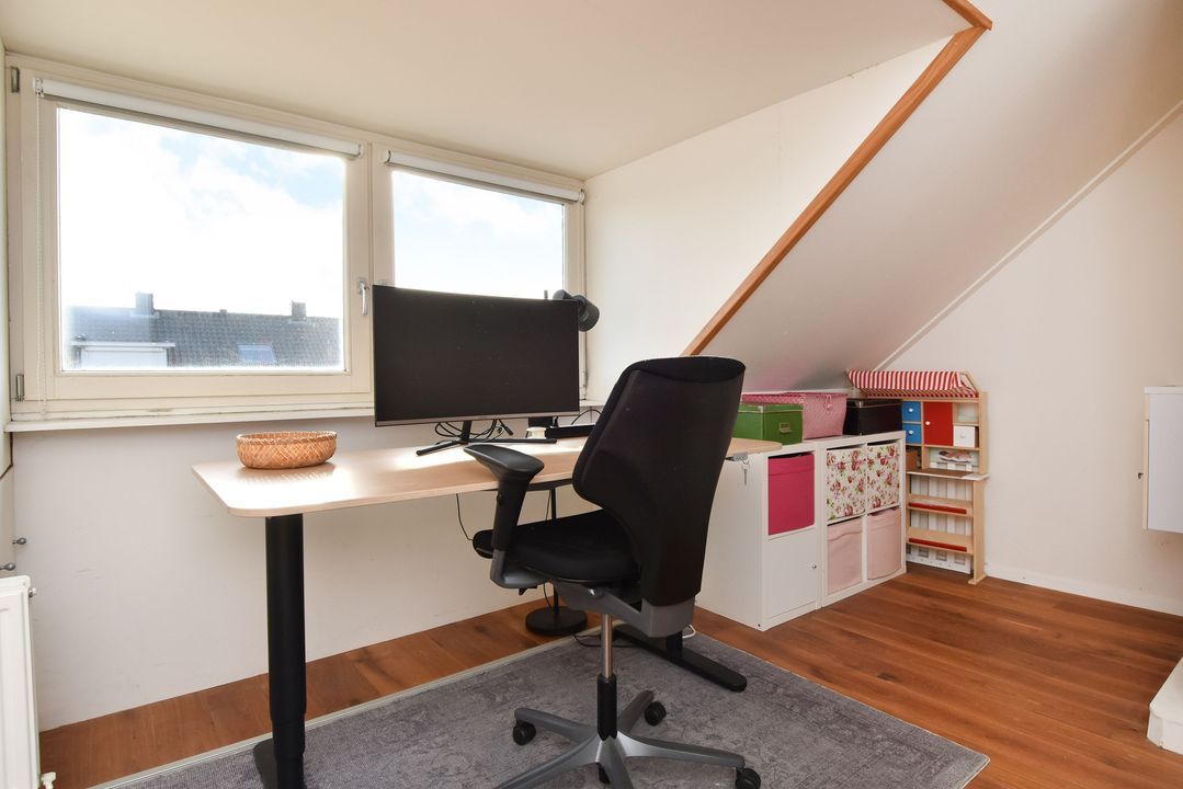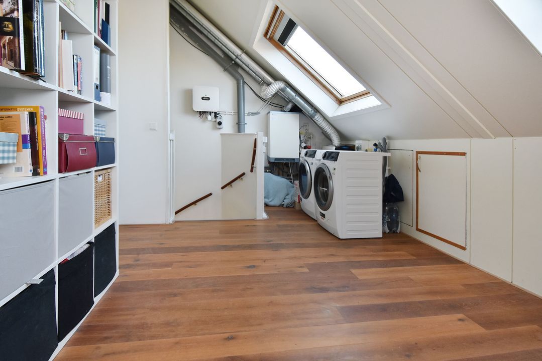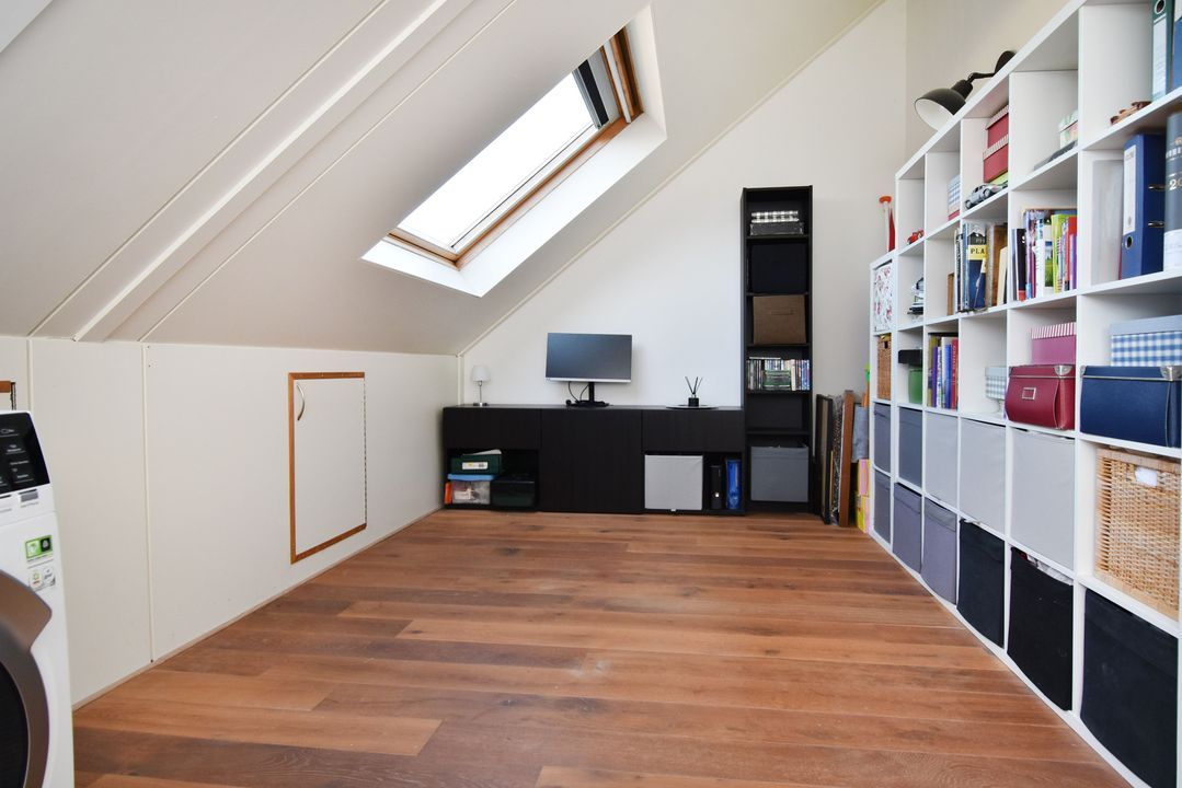 Spacious landing with wooden floor, knee walls, two Velux skylights, and space for the central heating combi boiler (Intergas 2008), washing machine, dryer, inverter for the PV solar panels, and mechanical ventilation unit. At the front is the fourth bedroom, which spans the entire width of the house and has wooden floorboards, a dormer window (with tilt and turn windows) and a sink.