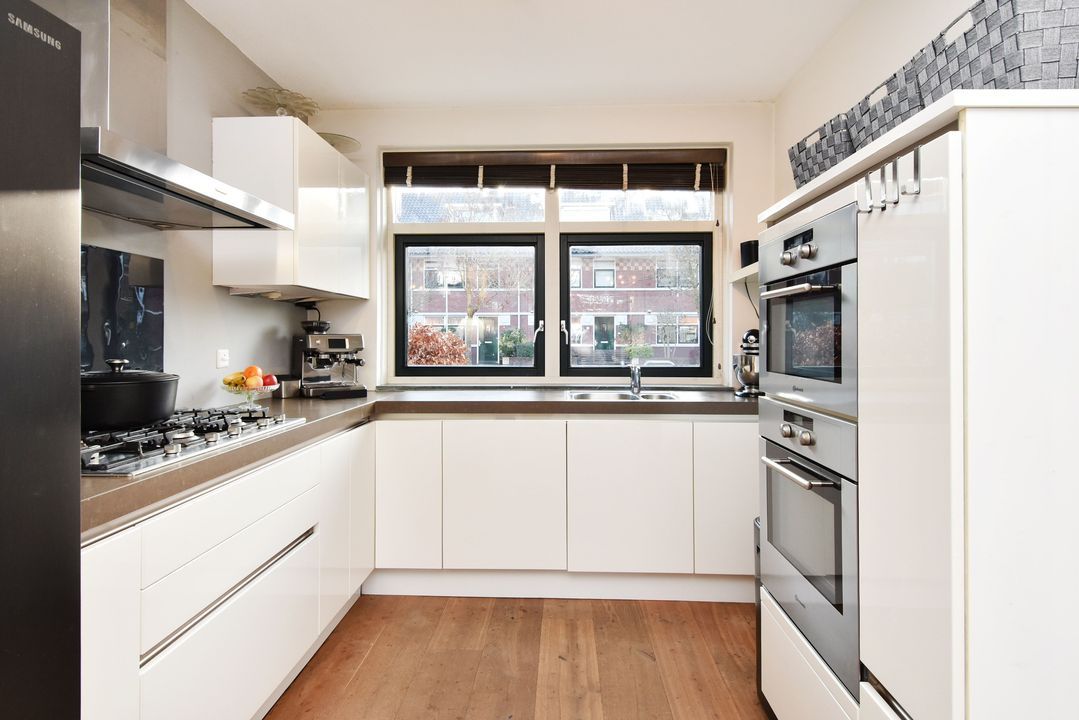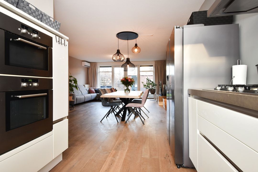 Entree/hal met meterkast, garderobe en vaste trapopgang. Lichte, half betegelde toiletruimte met zwevend toilet en fonteintje. Royale, tuingerichte woonkamer van circa 37m2 voorzien van fraaie Chapel houten vloerdelen, trapkast en twee openslaande deuren naar de zonnige achtertuin. Deze zonnige achtertuin is circa 10 meter diep en gelegen op het noordwesten. Verder is er een buitenkraan, een vrijstaande stenen berging met elektra en een achterom via de poort. Moderne, open hoekkeuken voorzien van spoelbak, combi oven-/magnetron, stoomoven, 5-pits gaskookplaat, RVS - afzuigschouw (naar buiten) en een vaatwasser (2019).
