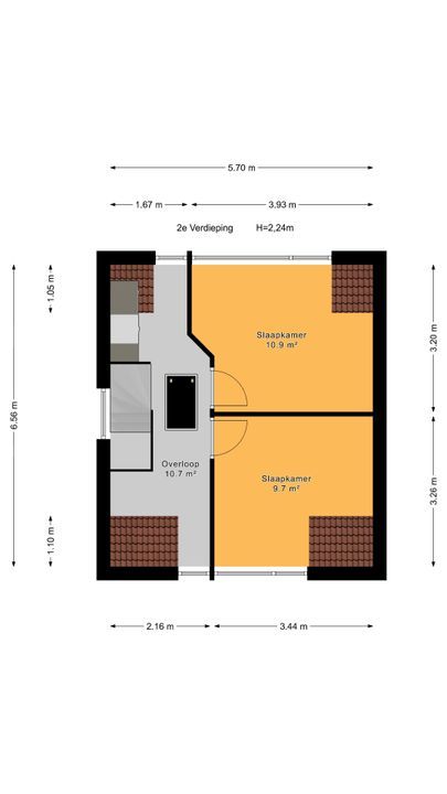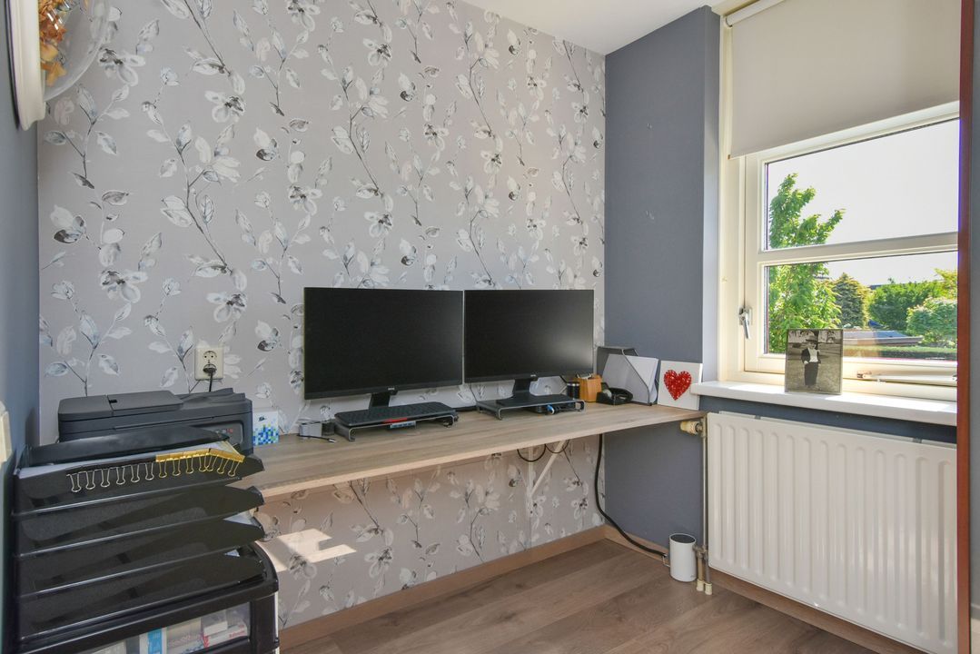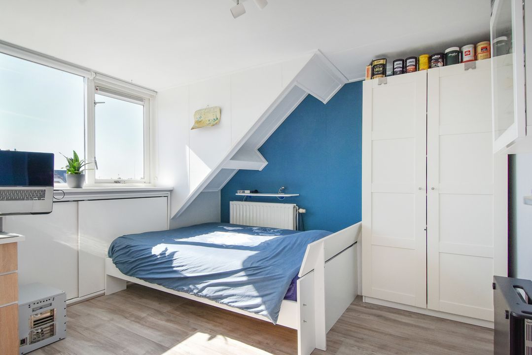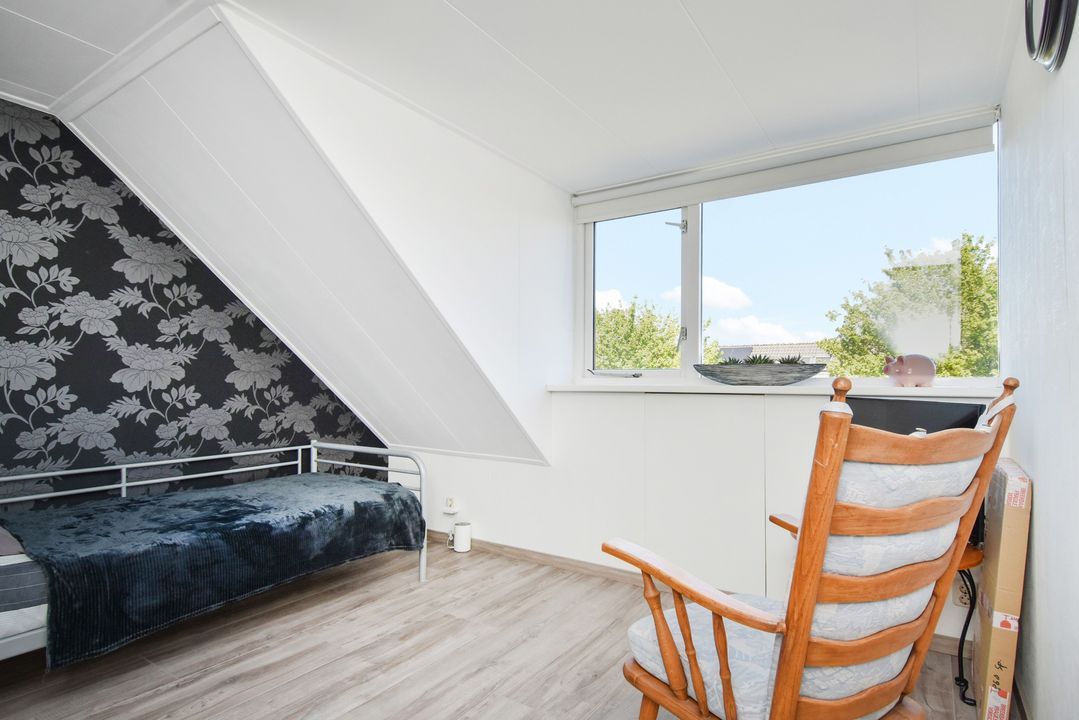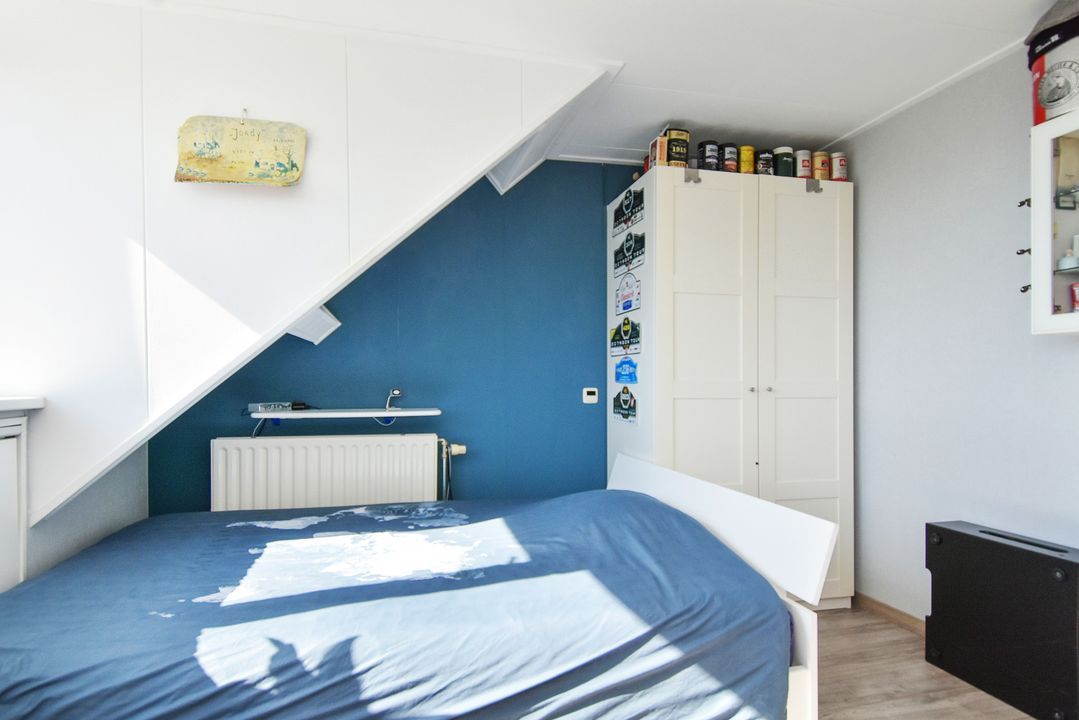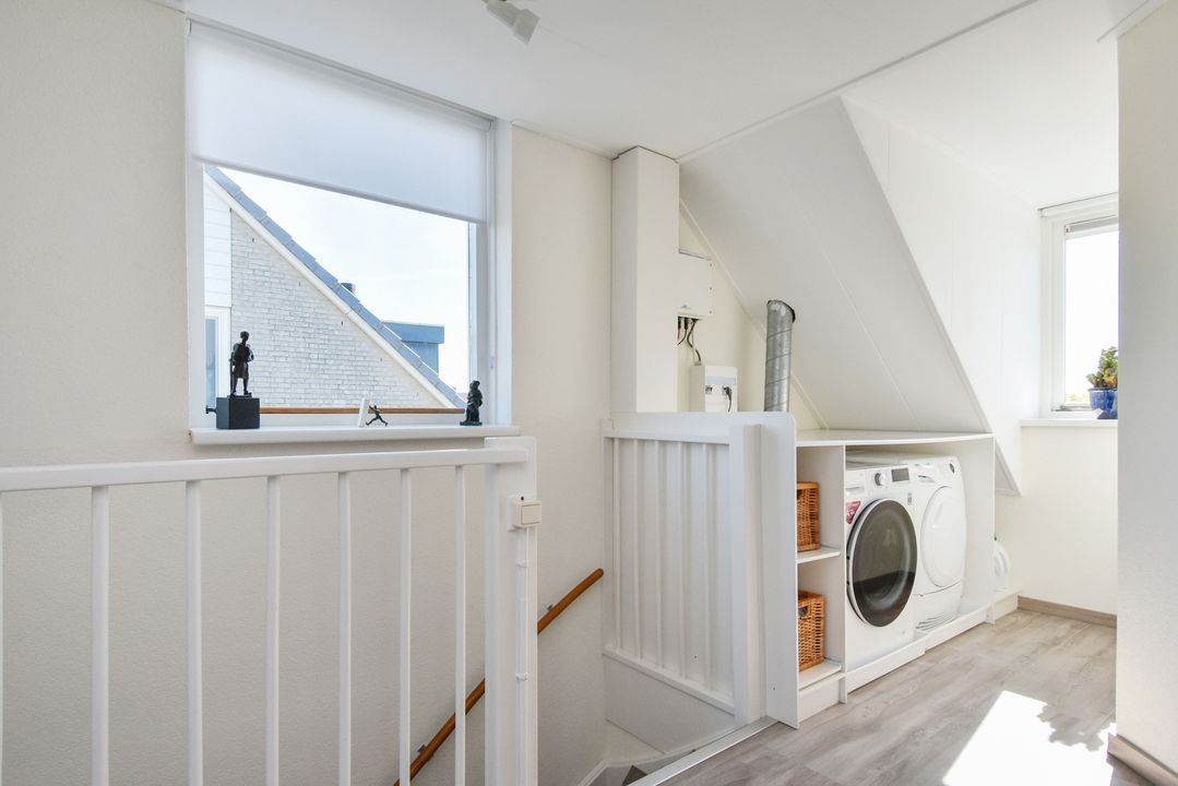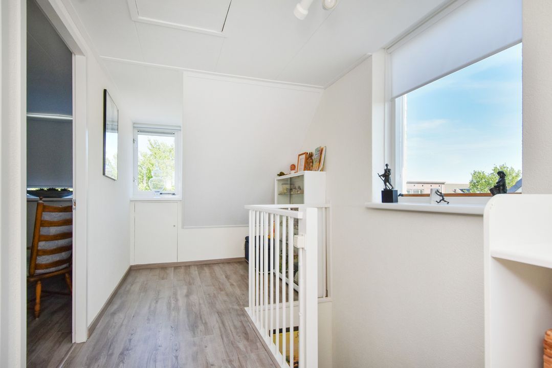 Ruime overloop voorzien van laminaatvloer, dakkapel voor- en achter, kopgevelraam, opstelplaats voor wasmachine, droger en omvormer zonnepanelen en vlizotrap naar bevloerde bergvliering. Voorslaapkamer met laminaatvloer en dakkapel. Achterslaapkamer met laminaatvloer en dakkapel.