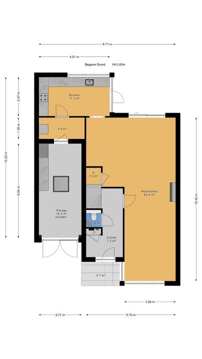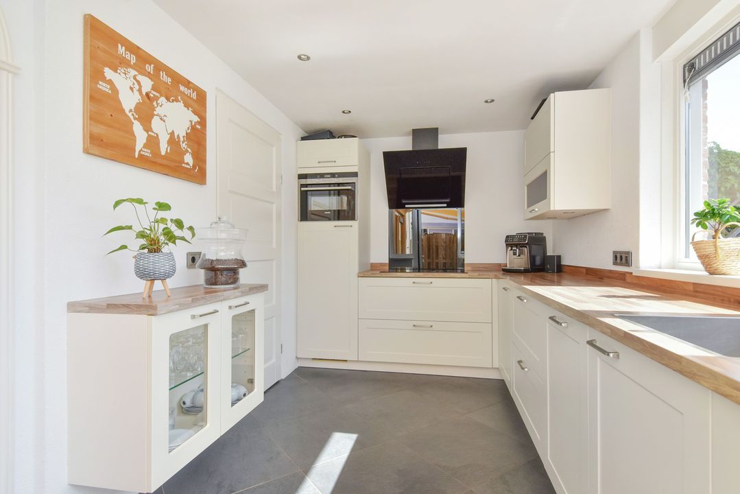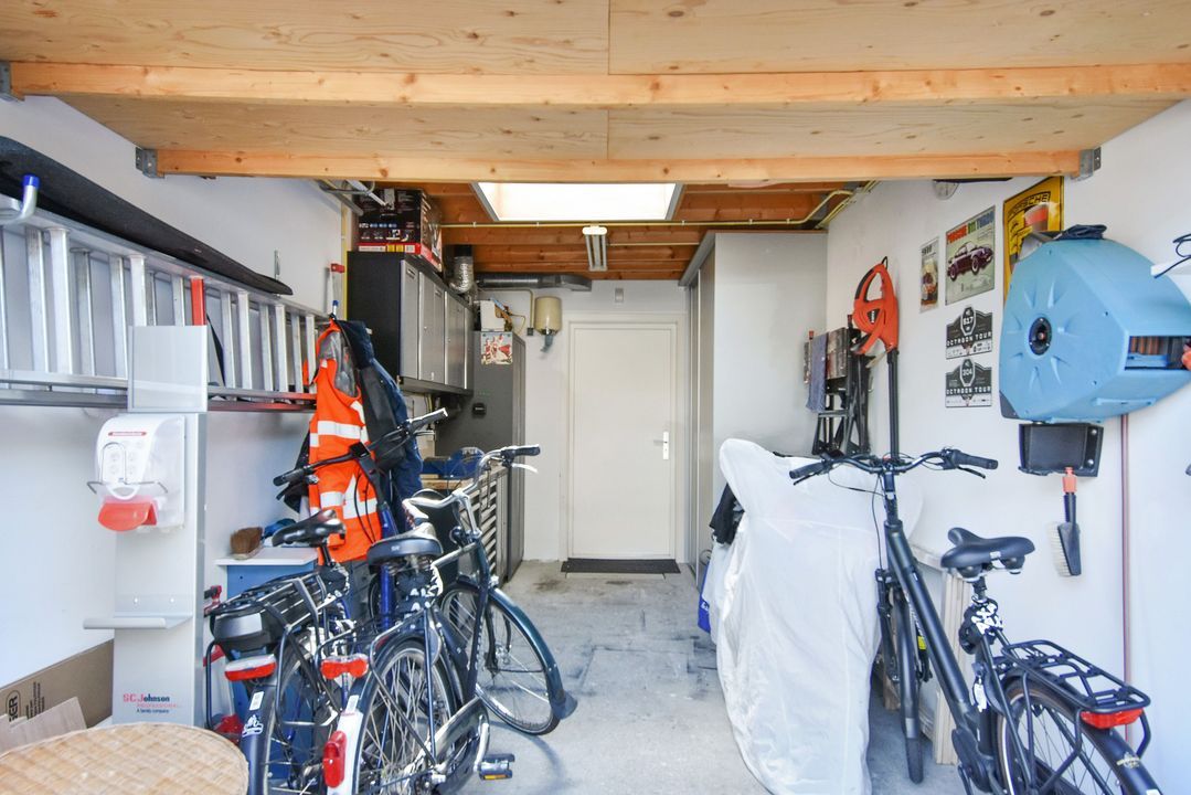 Voortuin. Entree/hal met meterkast, garderobe en trapopgang naar de eerste verdieping. Moderne, volledig betegelde toiletruimte met zwevend toilet en fonteintje. Sfeervolle woonkamer van circa 43m2 voorzien van fraaie plavuizen vloer met vloerverwarming, erker aan de voorzijde, trapkast en aluminium schuifpui naar zonnige achtertuin. Aan de achterzijde bevindt zich de moderne hoekkeuken met inbouwapparatuur, te weten: spoelbak, Quooker, inductie kookplaat, afzuigkap, vaatwasser, combi oven-/magnetron, koelkast en deur naar de achtertuin. De achtertuin is keurig aangelegd, circa 18.00m x 8.70m en gelegen op het zonnige zuidoosten. Aparte bijkeuken met deur naar de aangebouwde garage. De garage heeft een lichtkoepel, mechanische ventilatie en twee openslaande deuren naar de oprit.