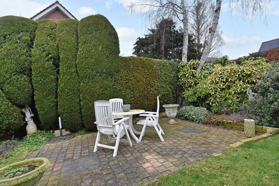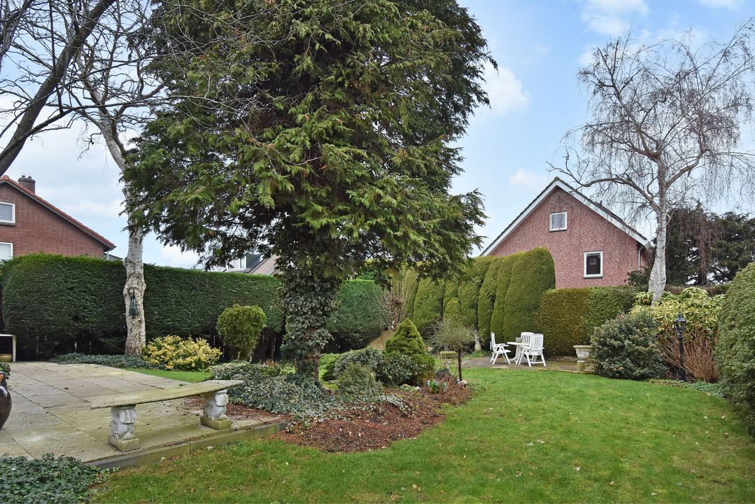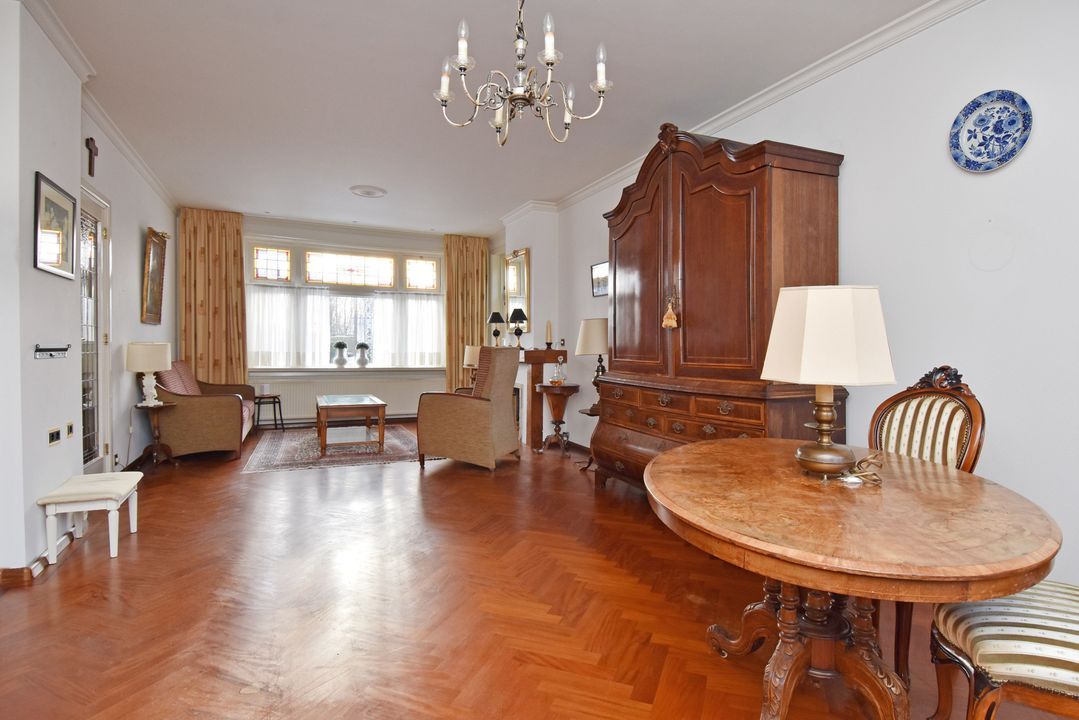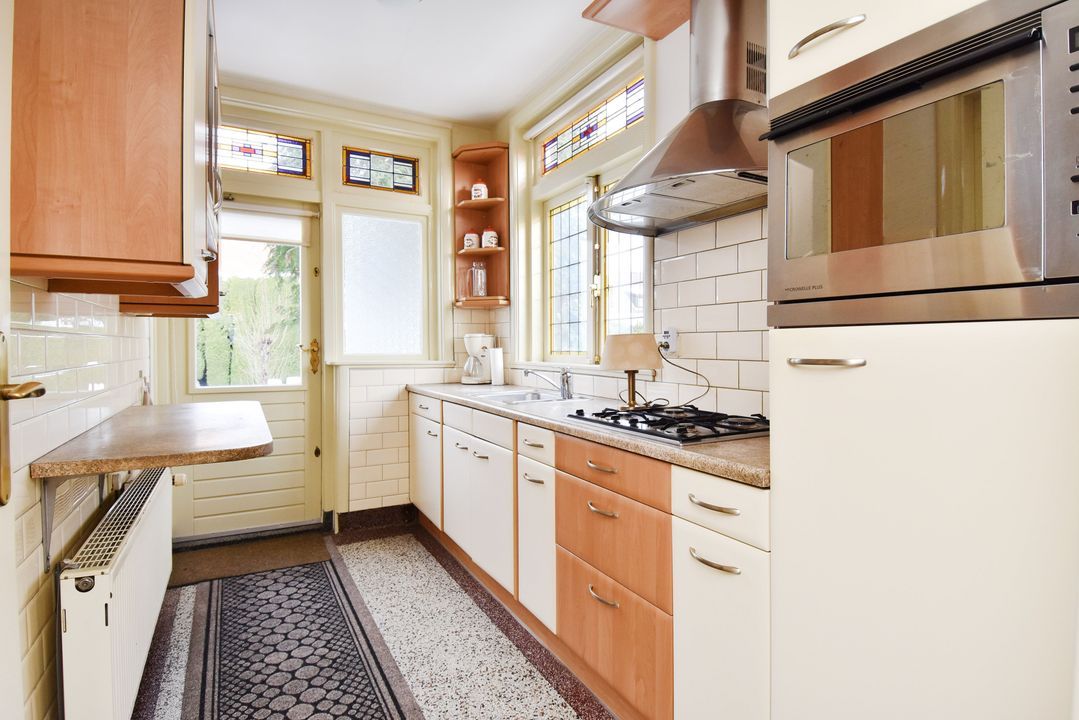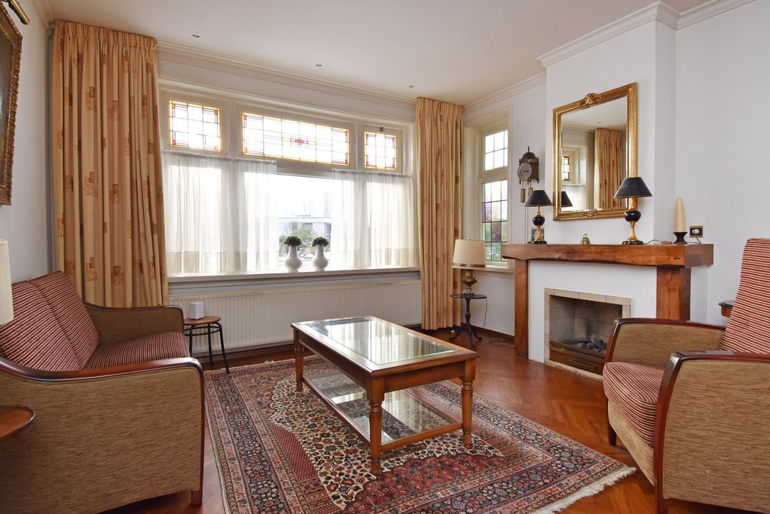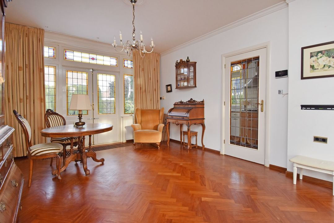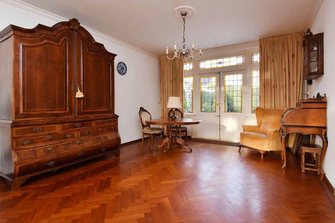Via een brug kom je in de voortuin. Overdekte entree/hal voorzien van granitovloer, zijraam, meterkast, trapkast met opstelplaats voor CV-Combiketel (Vaillant 2022) en trapopgang. Standaard toiletruimte met toilet en granitovloer. Lichte doorzonkamer van circa 35m2 voorzien van fraaie visgraat parketvloer met bies en plint, gashaard, zijraam, glas-in-lood ramen en twee openslaande deuren naar de zonnige en zeer beschutte achtertuin. Gesloten keuken met granitovloer, zijraam en inbouwapparatuur, te weten: spoelbak, gaskookplaat, RVS - afzuigschouw, combi oven-/magnetron, koel-/vriescombinatie en buitendeur naar de achtertuin.