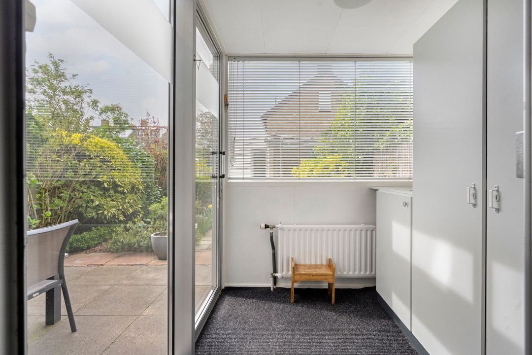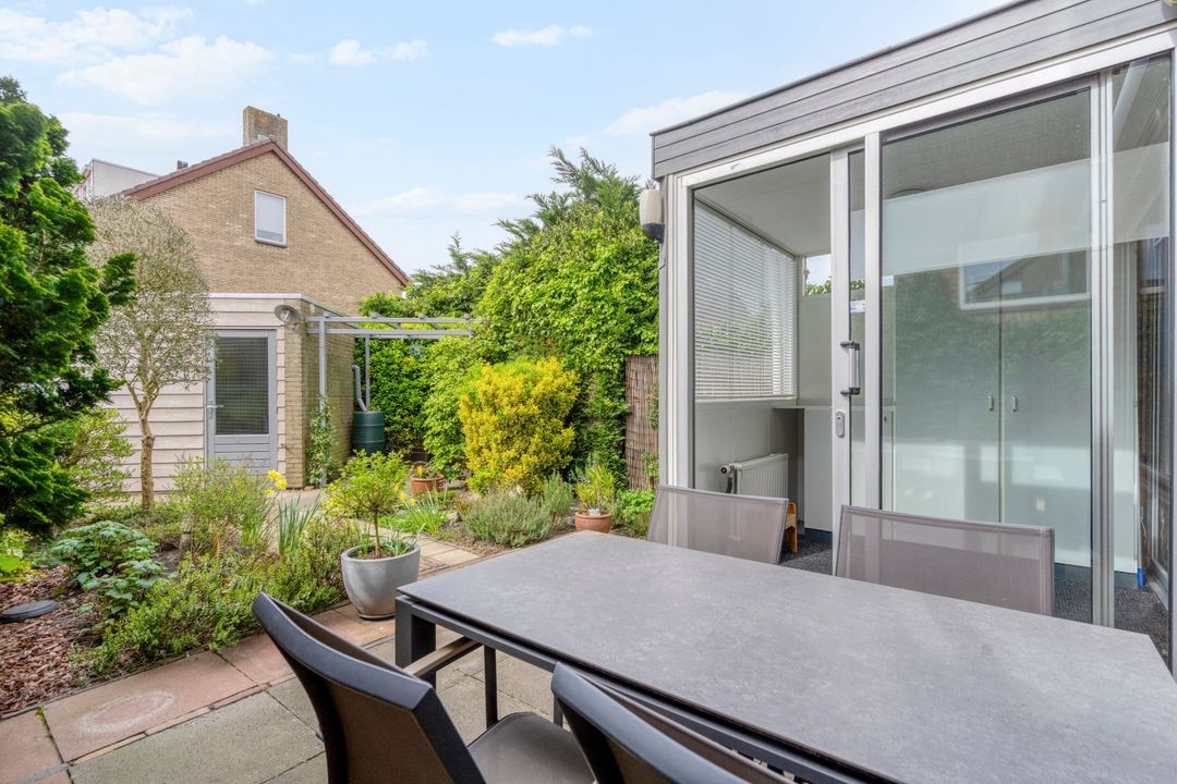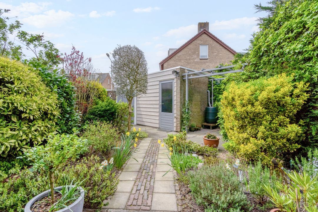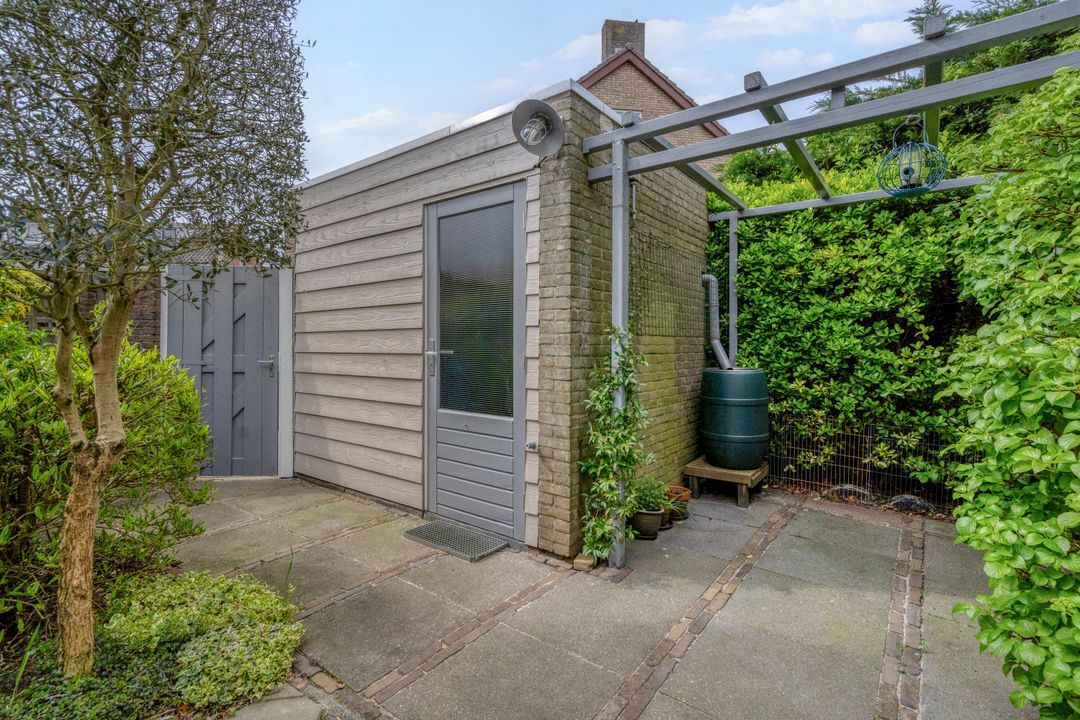 - De achtertuin ligt op het zonnige zuidwesten met een vrijstaande stenen berging en achterom