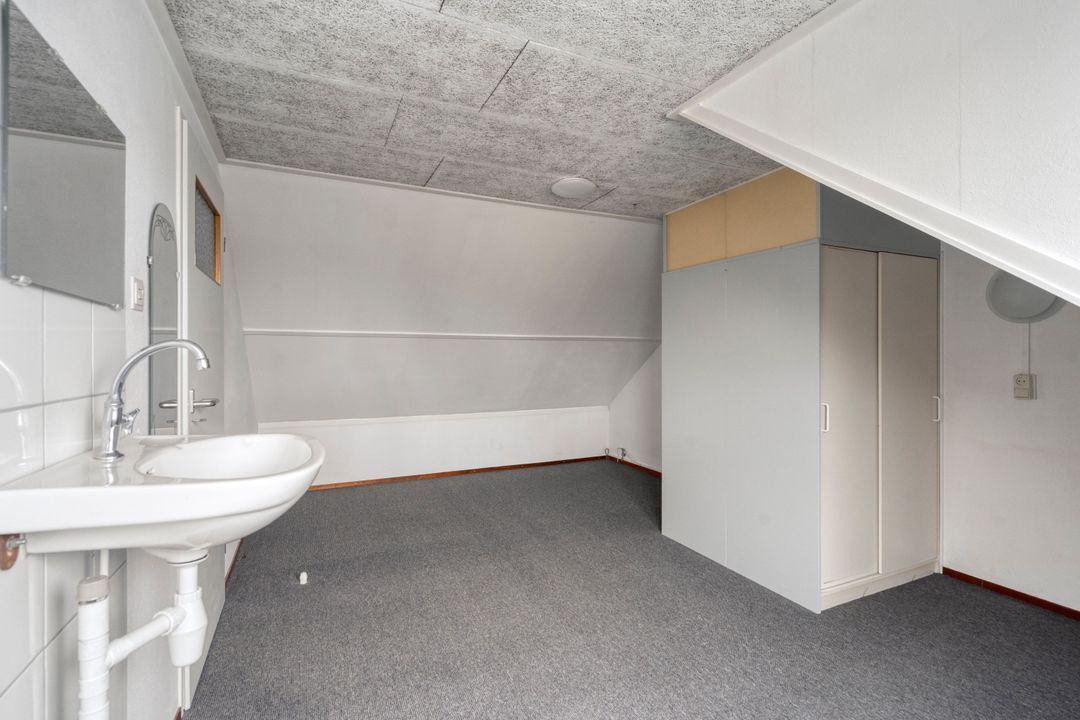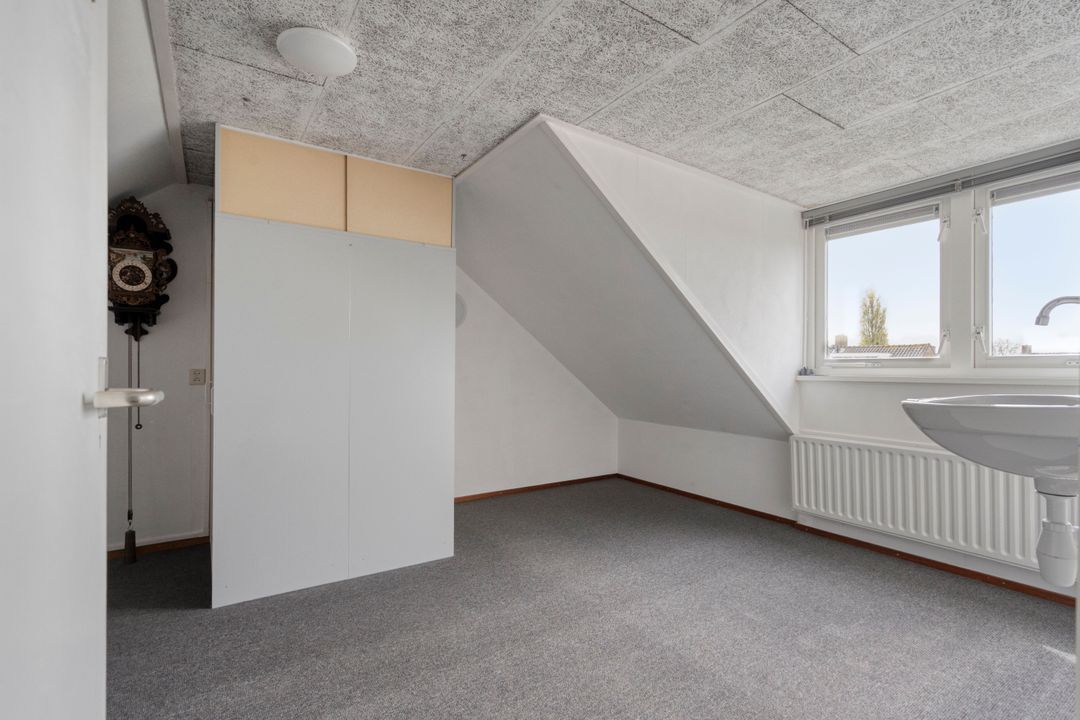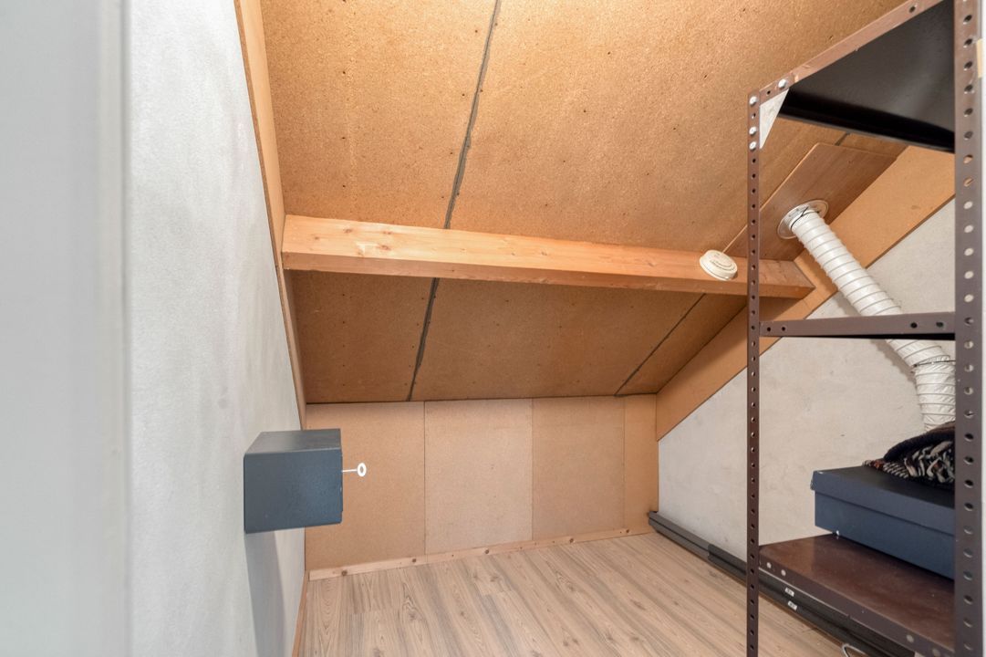 Overloop. Apart stookhok met opstelplaats voor CV-Combiketel (Remeha 2008). Berghok met opstelplaats voor mechanische ventilatie unit. Zolderkamer met wastafel en dakkapel aan de achterzijde.