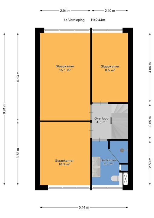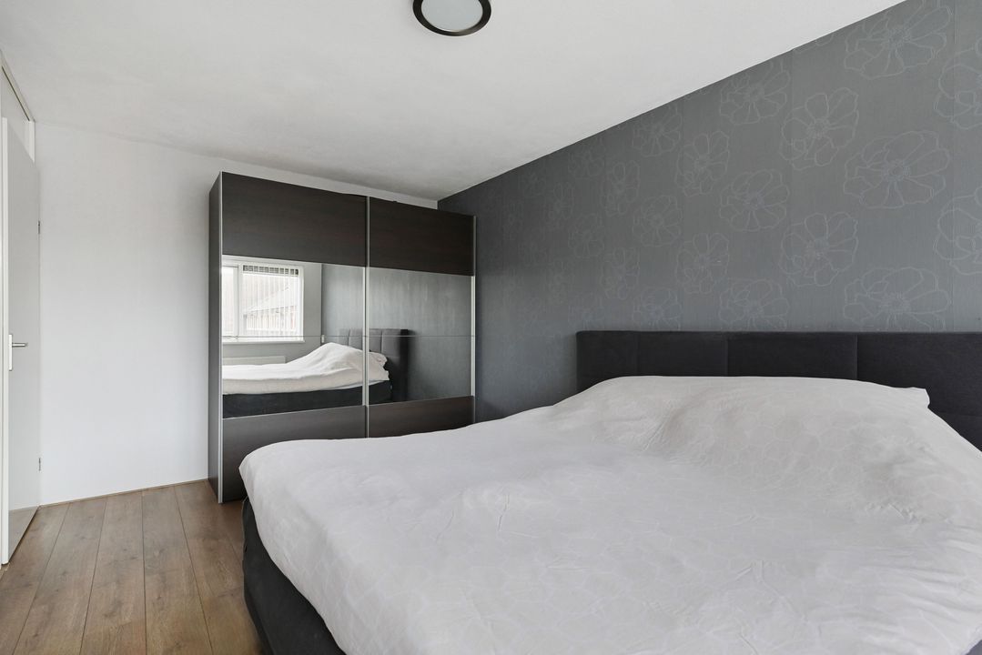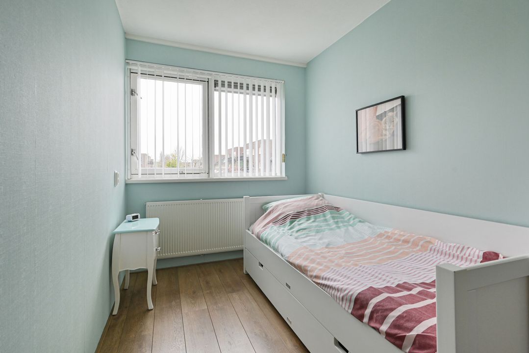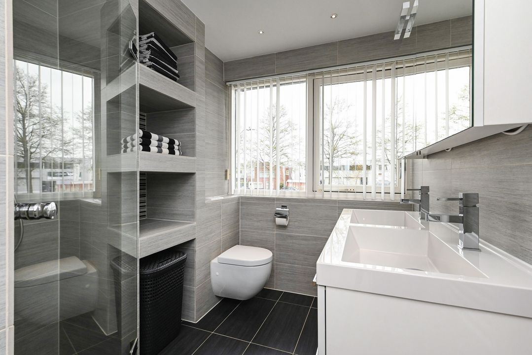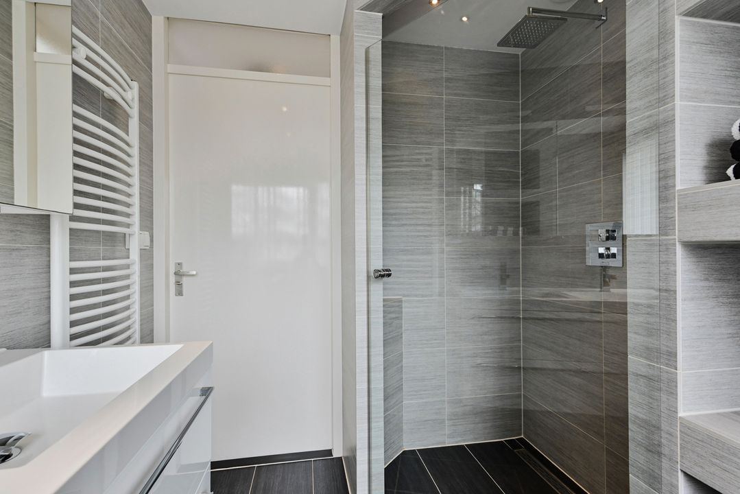 Overloop, voorslaapkamer (ca. 11m2), twee achterslaapkamers (ca. 15m2 en 8,5m2). Moderne volledig betegelde badkamer met inloopdouche met easydrain, 2e zwevend toilet, handdoekradiator, badkamermeubel met twee wastafels, twee kranen en spiegelkast en een verlaagd plafond met inbouwspots. De gehele 1e verdieping is voorzien van een laminaatvloer.