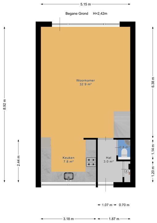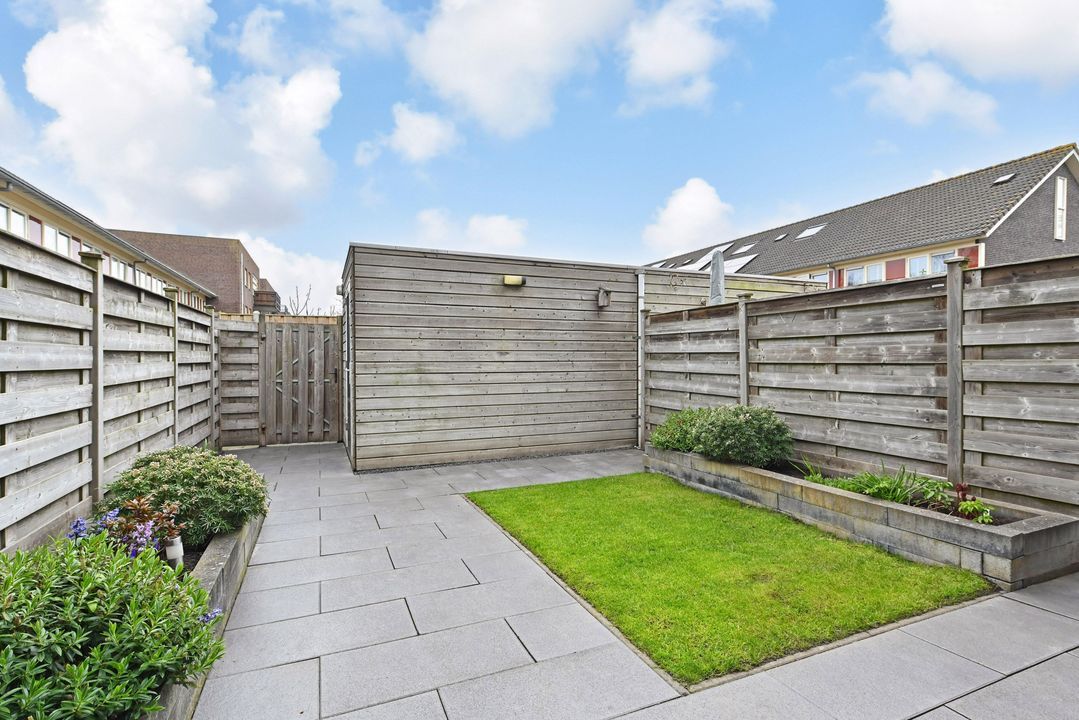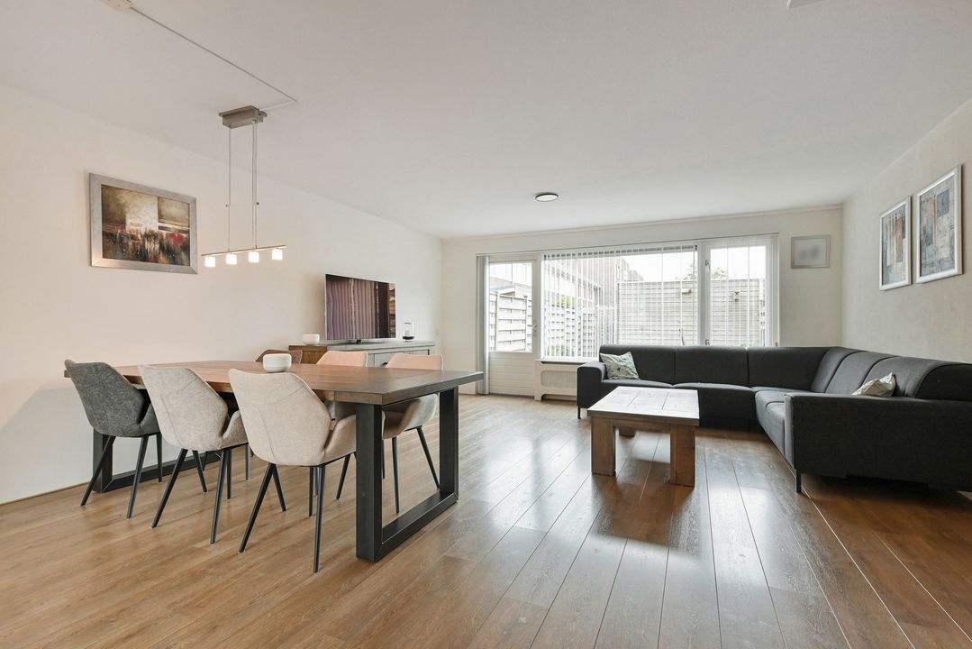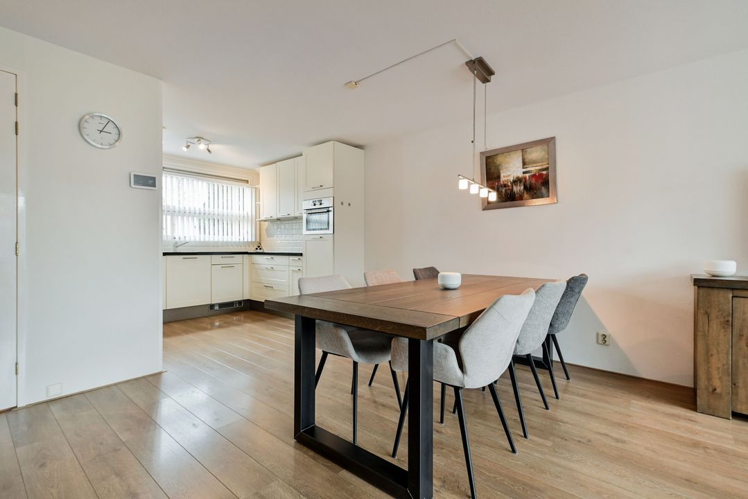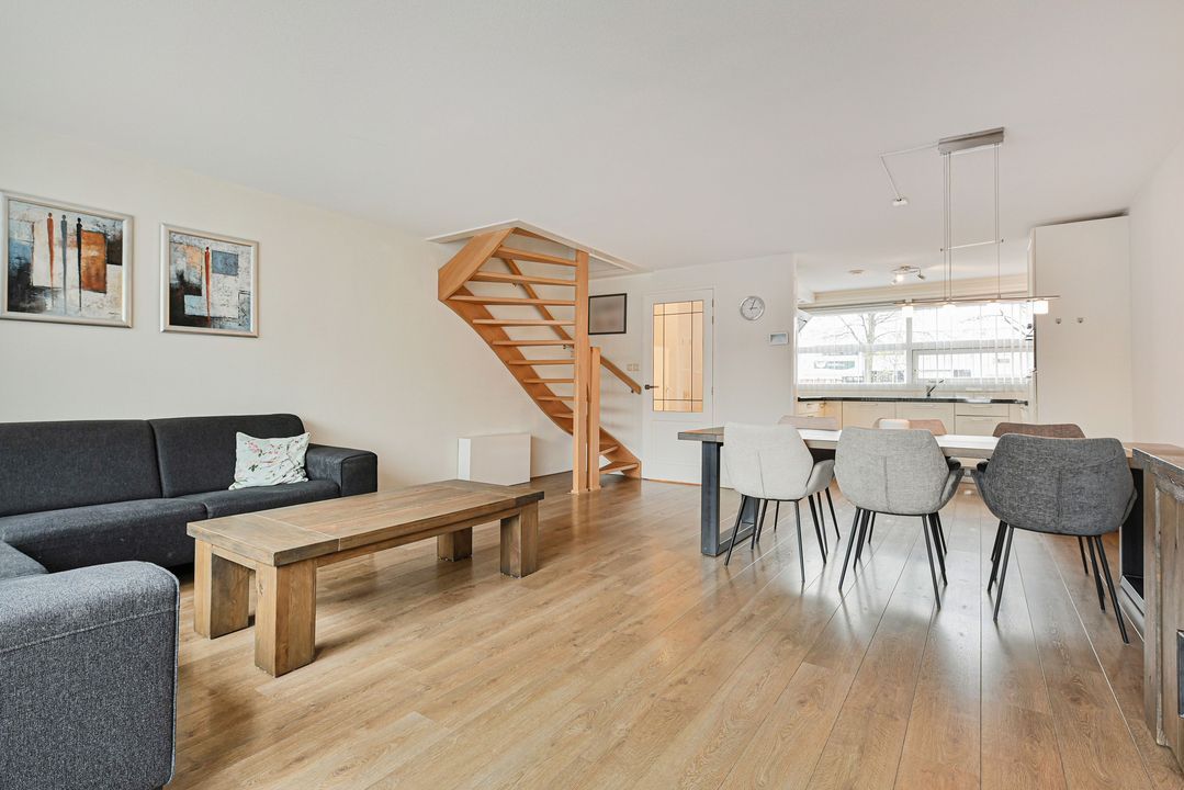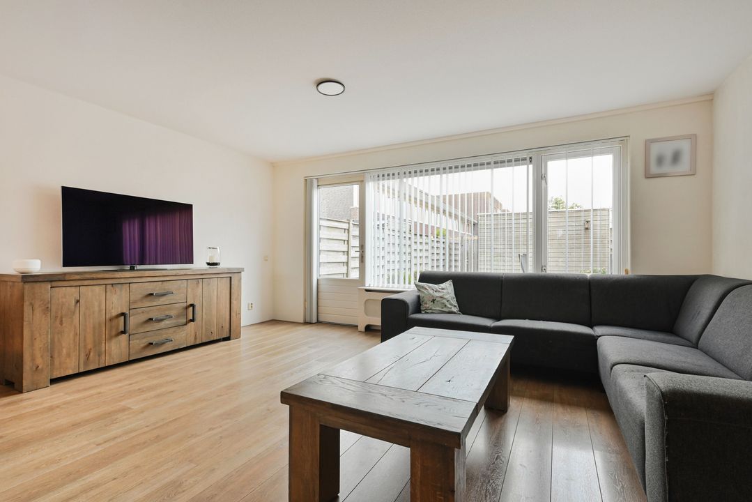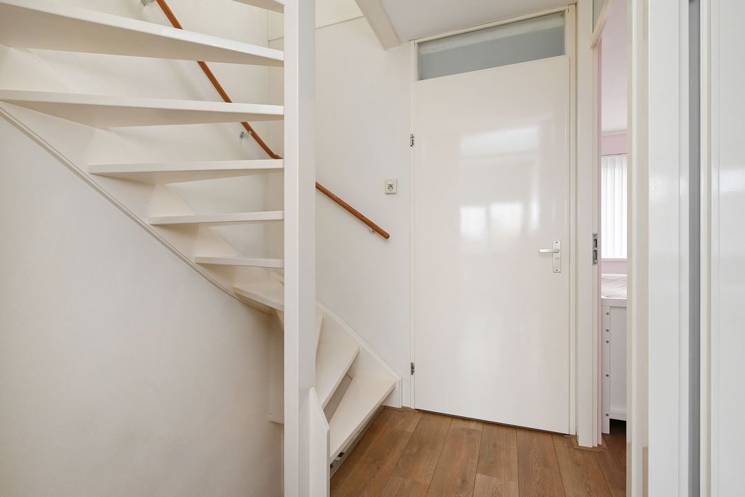 Verzorgde voortuin. Entree/hal met garderobe, meterkast, modern volledig betegeld zwevend toilet met fonteintje, toegang tot tuingerichte woonkamer (ca. 33m2). Achterdeur met toegang tot de zonnige achtertuin op het zuidwesten met houten berging en achterom. Aan de voorzijde gelegen ruime U-vormige open keuken voorzien van diverse apparatuur, te weten: koelkast, vriezer, inductiekookplaat (2025) en combioven/magnetron. De gehele begane grondvloer is voorzien van een laminaatvloer. Vanuit de woonkamer bereik je de trap naar de eerste verdieping.