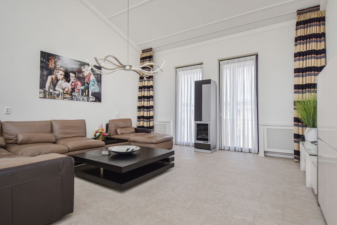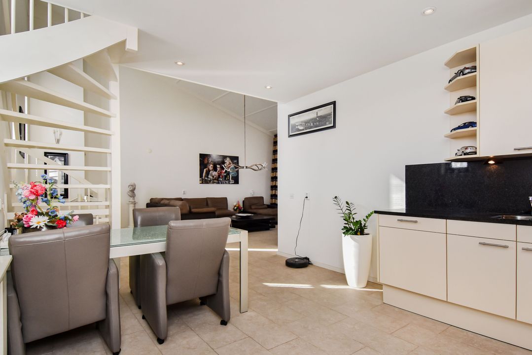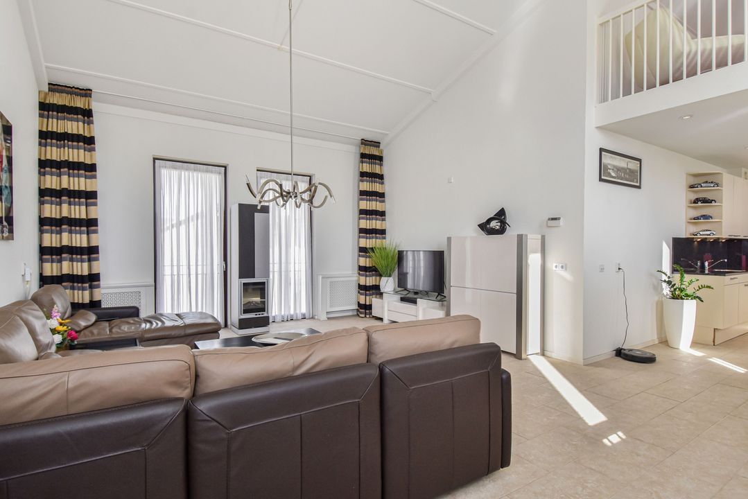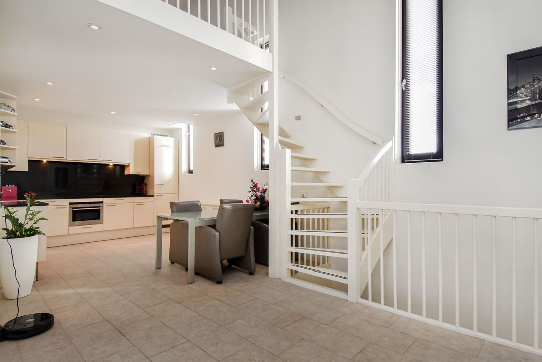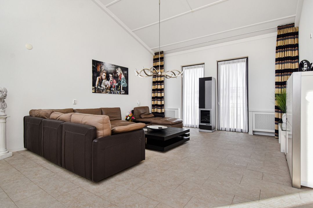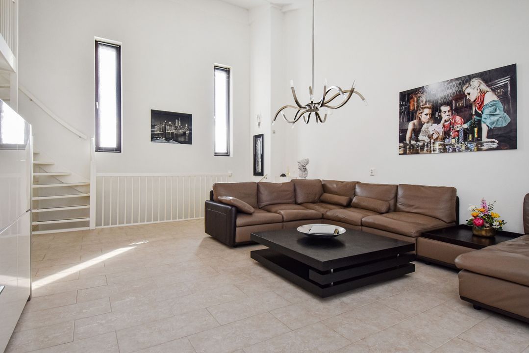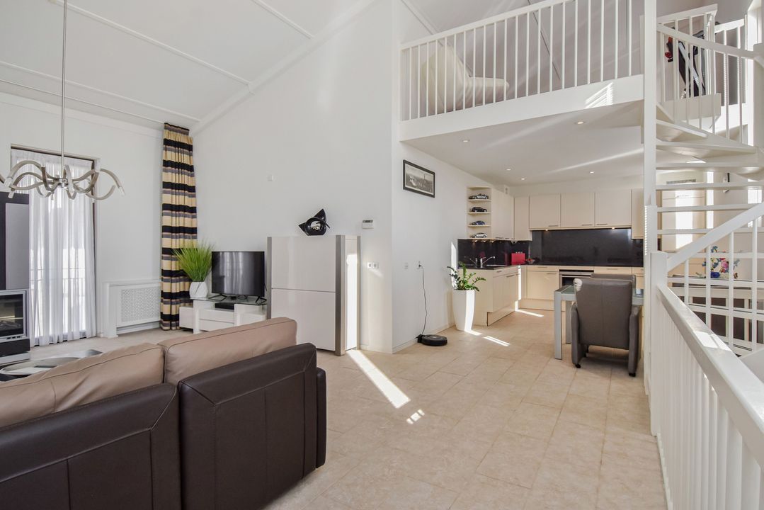 Via de trap bereikt u de lichte en ruime woonkamer van ca. 36 m² met hoge nok en ramen aan beide zijden. De plavuizenvloer met vloerverwarming zorgt voor comfort en een moderne uitstraling.
