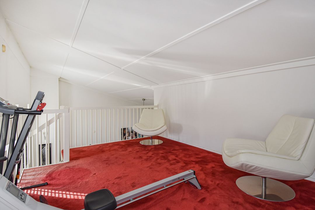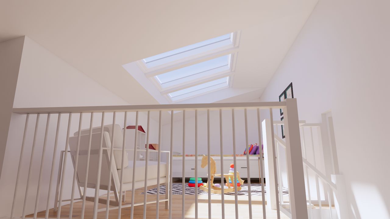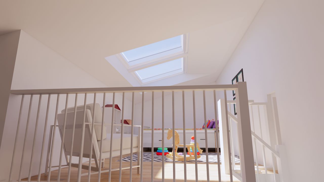 Via de open trap in de woonkamer bereikt u de ruime vide: een multifunctionele ruimte die u volledig naar wens kunt benutten. Denk aan: