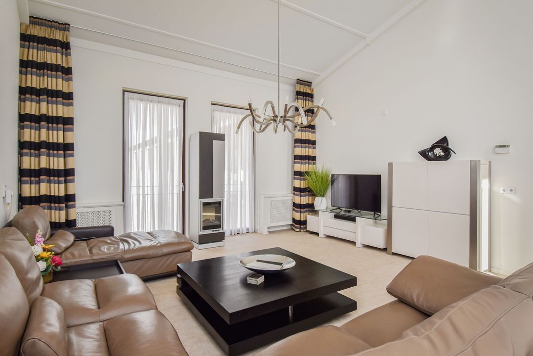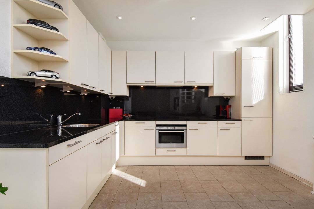 A staircase leads to the bright and generous living room of approx. 36 m² with high ceilings and windows on both sides. The tiled floor with underfloor heating provides comfort and a modern look.