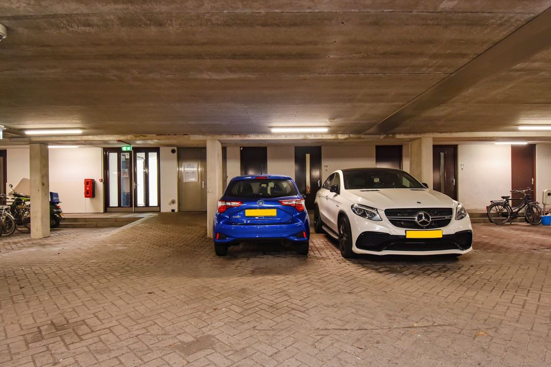 Centrale, afgesloten entree met brievenbussen, intercom, lift en toegang tot de parkeergarage. De woning beschikt over een eigen parkeerplaats direct naast het trappenhuis. Een tweede parkeerplaats is optioneel te koop voor € 22.500,-. Daarnaast is er een eigen inpandige berging.