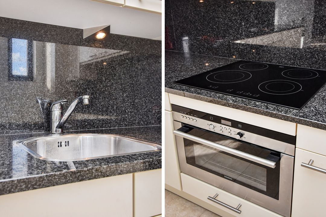 De ruime Siematic woonkeuken (ca. 18 m²) is voorzien van een natuurstenen blad en inbouwapparatuur: combi?oven/magnetron, vaatwasser, koelkast, vriezer, inductiekookplaat, spoelbak en vlakscherm afzuigkap. Een ideale plek voor wie van koken en gezellig tafelen houdt.