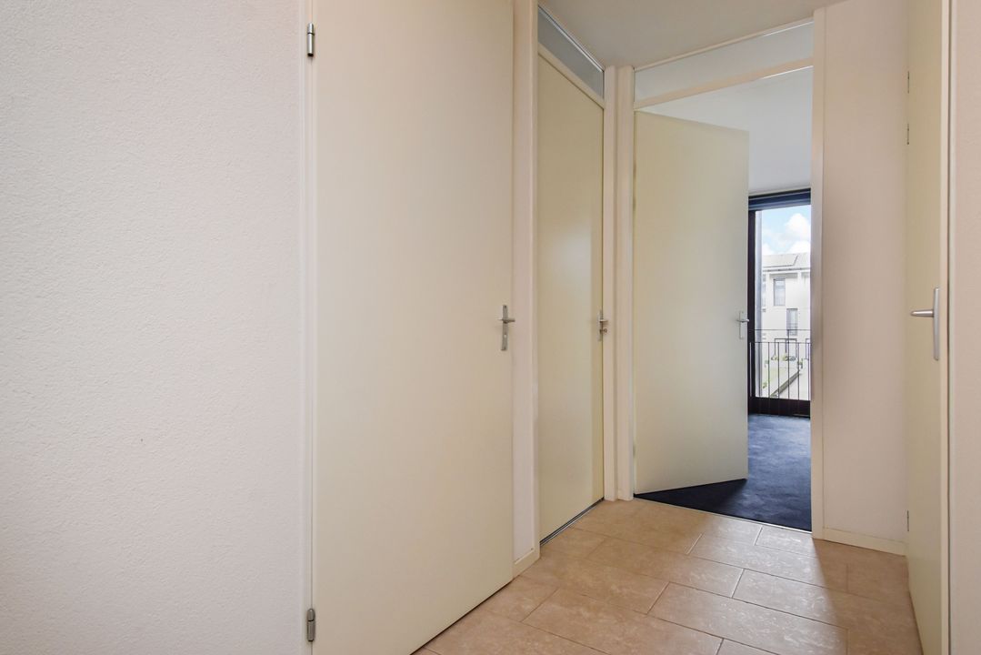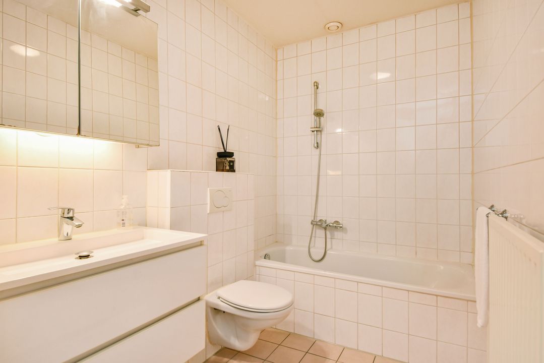 Entree met hal, meterkast, twee slaapkamers, een aparte wasruimte en de badkamer. De badkamer is volledig betegeld en voorzien van vloerverwarming, ligbad, zwevend toilet en wastafelmeubel met spiegelkast.