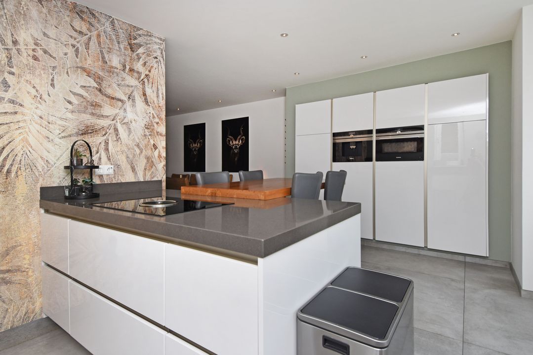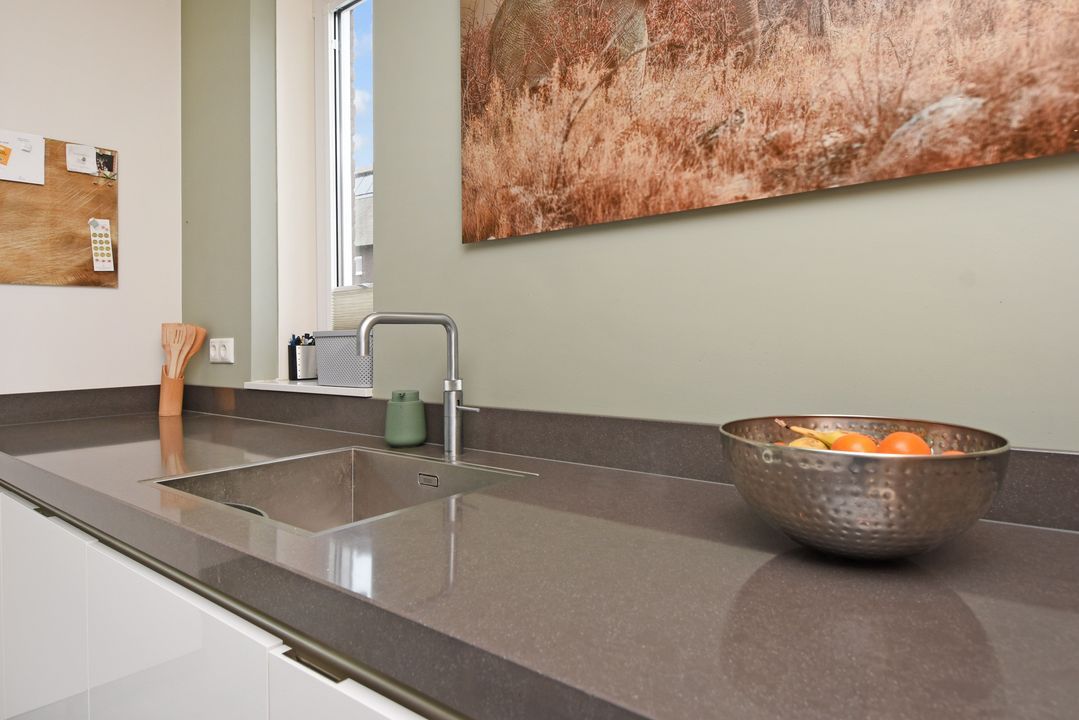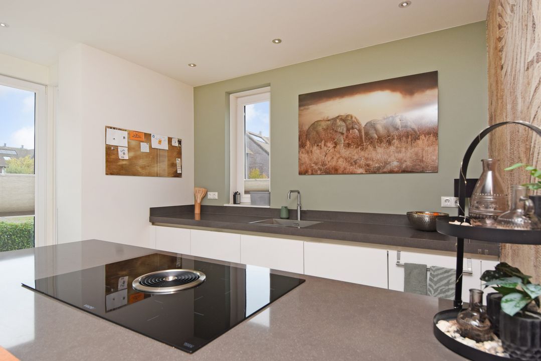 Through the front garden and driveway you come to the side entrance of the house. Entrance / hall with meter cupboard, stairs cupboard and fixed staircase. Luxurious, half tiled toilet room with floating toilet and sink. Attractive, expanded living room of approximately 47 m2 with tiled floor with underfloor heating, plastered walls and ceiling and a wide plastic sliding door to the sunny south facing backyard. Against the rear wall is a wide veranda / conservatory and back of the garden is an aluminum shed. At the front of the house is the luxurious SIEMATIC kitchen with bay window, cooking island with induction hob, BORA exhaust system, refrigerator, freezer, dishwasher, sink with Quooker, built-in coffee / espresso machine, combi oven / microwave and an attached wooden tabletop.