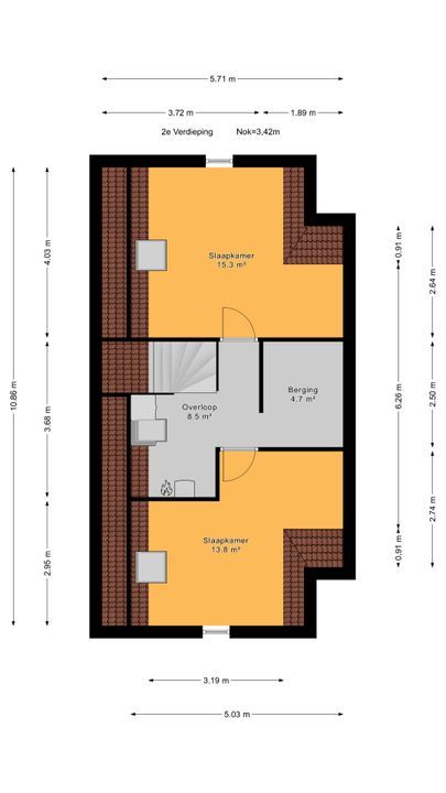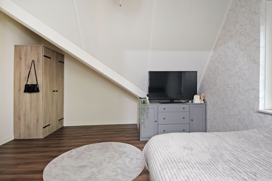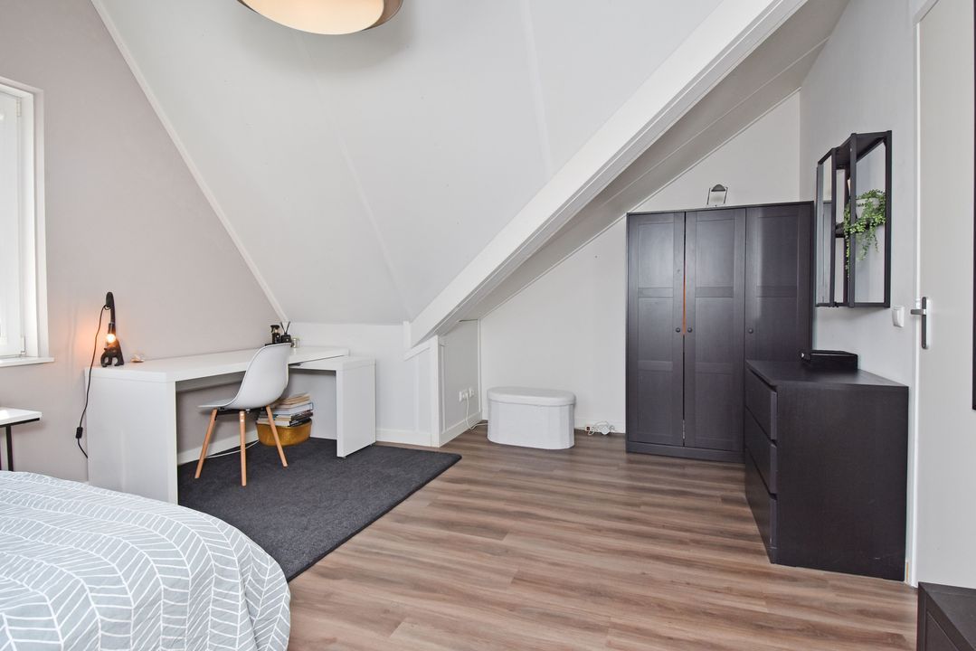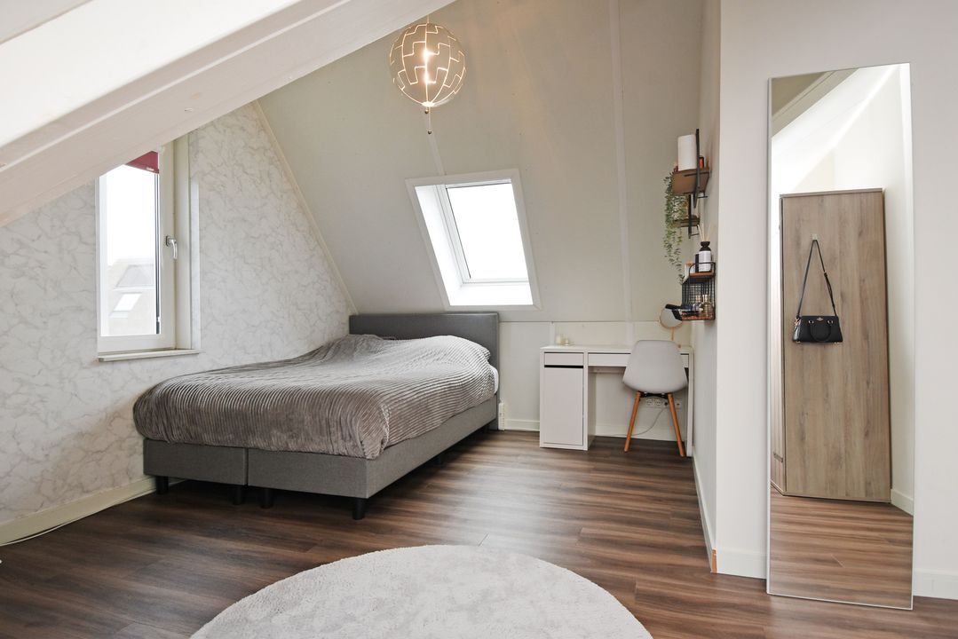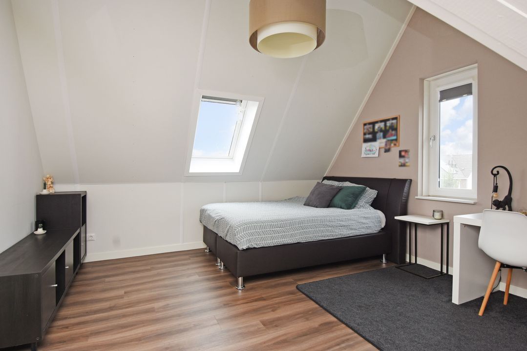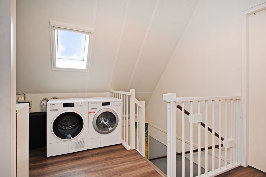 Playful landing with Velux skylight and setup for washing machine, dryer, mechanical ventilation unit, inverter, central heating combi boiler (Intergas HRE 2018). Separate laundry/storage room. Spacious front bedroom with Velux skylight, end gable window and knee walls. Spacious back bedroom with Velux skylight, knee partitions and end wall window.