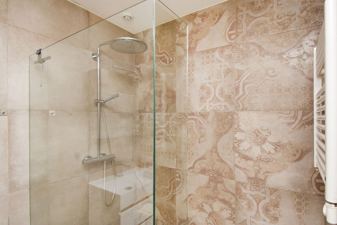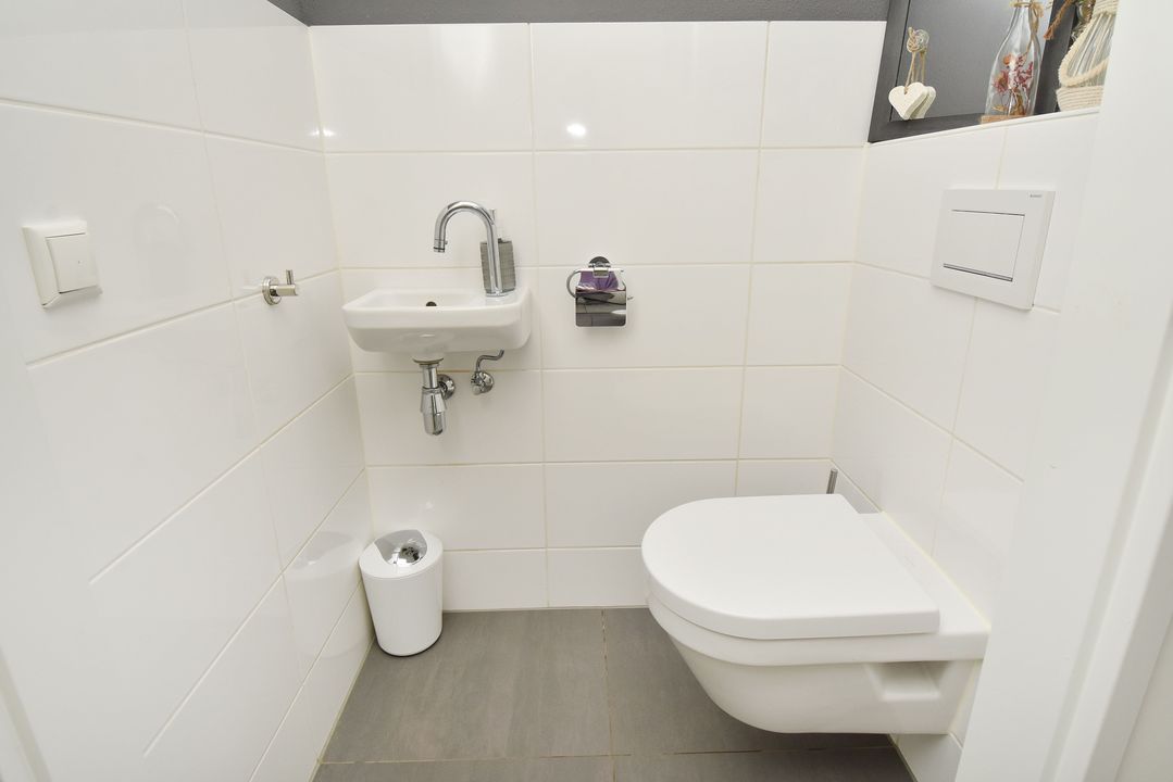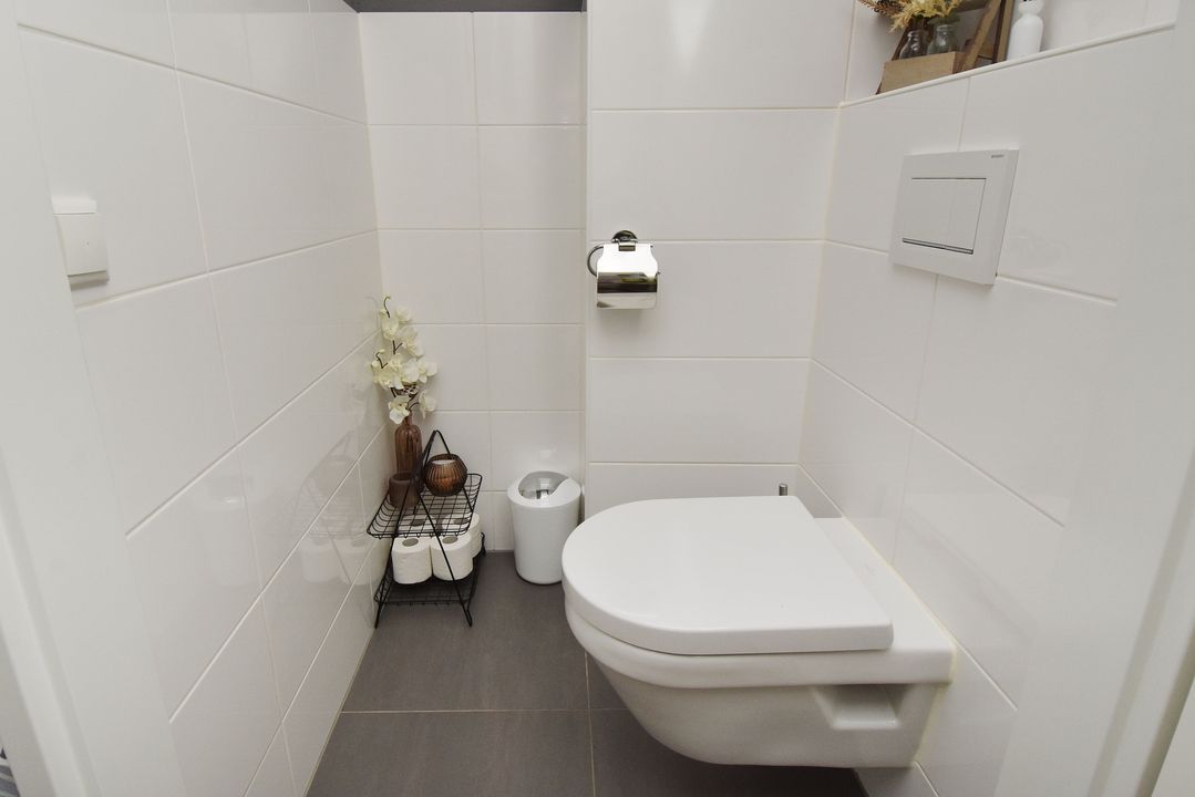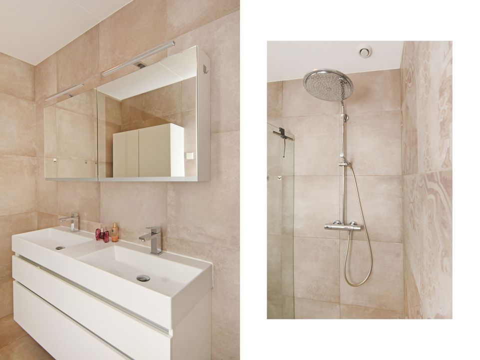 Spacious L-shaped landing with side window and fixed staircase. Modern, half-tiled toilet room with floating toilet. 2 front bedrooms with unobstructed views. Modern, fully tiled bathroom with spacious walk-in shower with glass screen, easydrain and thermostat faucet, bathroom cabinet with double sink and mirror cabinet, separate bathroom cabinet and electric towel radiator. Spacious back bedroom with wide closet. The landing and all bedrooms have PVC flooring with underfloor heating.
