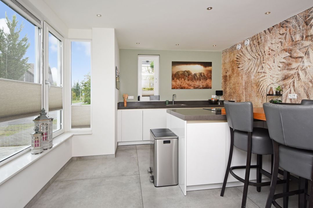 Binnenin biedt de woning een riante woonkamer van 47 m2, een sfeervolle woonkeuken met een prachtige erker, een kookeiland en moderne inbouwapparatuur. Met 5 slaapkamers is er voldoende ruimte voor het hele gezin. De badkamer en toiletruimten zijn eigentijds en stijlvol ingericht.
