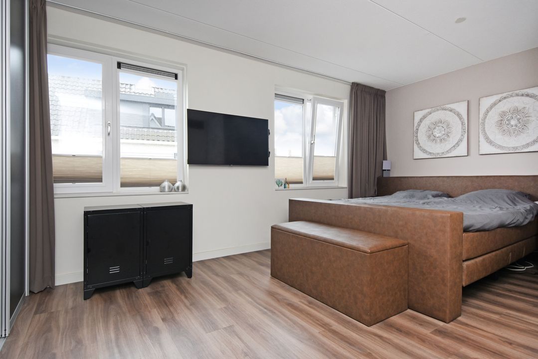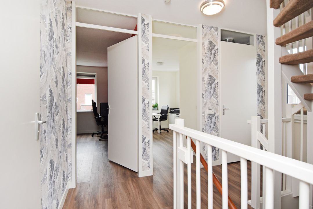 Ruime L-vormige overloop met zijraam en vaste trapopgang. Moderne, half betegelde toiletruimte met zwevend toilet. 2 voorslaapkamers met vrij uitzicht. Moderne, volledig betegelde badkamer voorzien van ruime inloopdouche met glazen scherm, easydrain en thermostaatkraan, badkamermeubel met dubbele wastafel en spiegelkast, losse badkamerkast en elektrische handdoekradiator. Ruime achterslaapkamer met garderobekast over de gehele breedte van de kamer. De overloop en alle slaapkamers hebben een PVC vloer met vloerverwarming.
